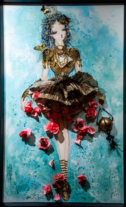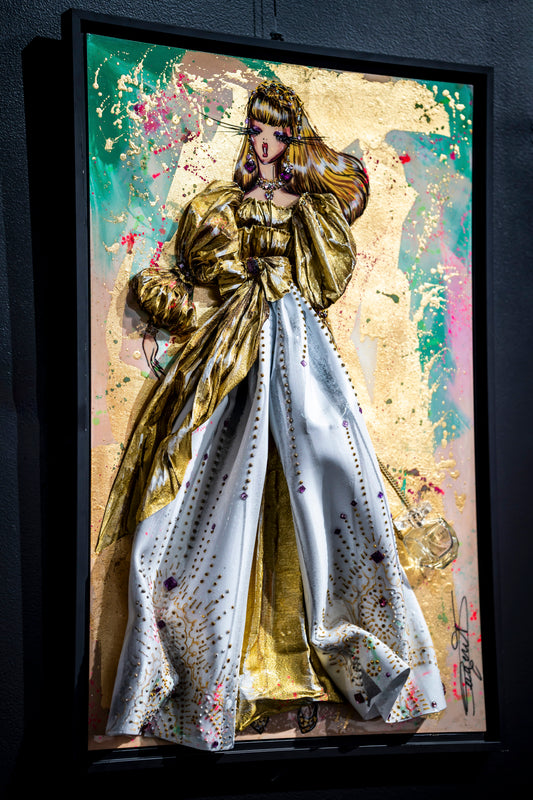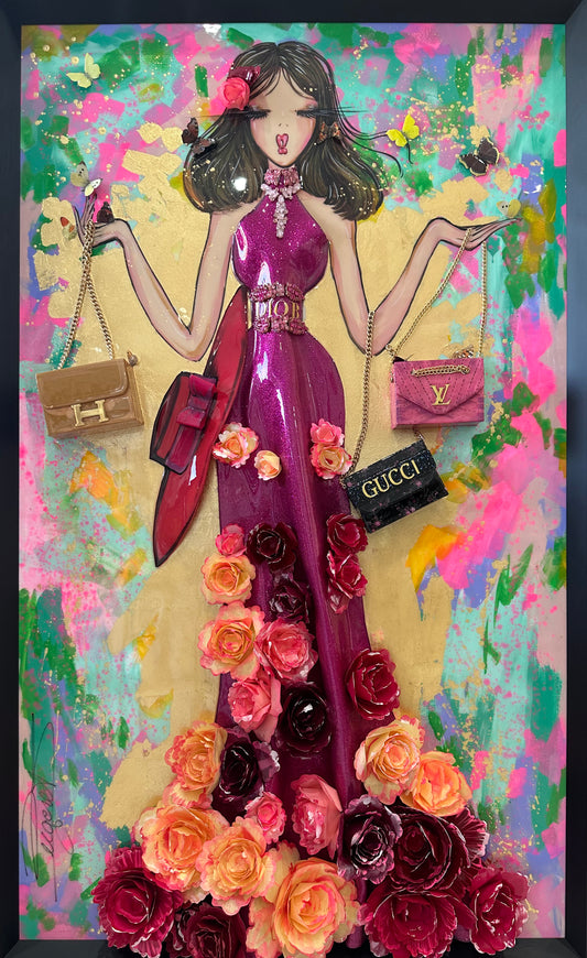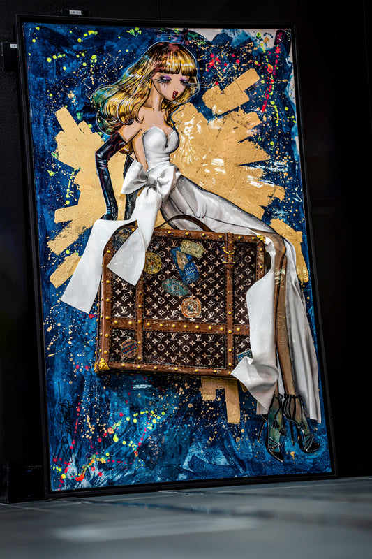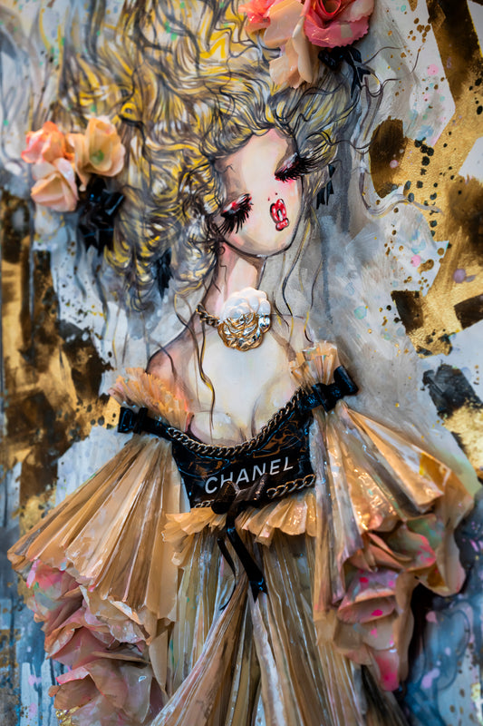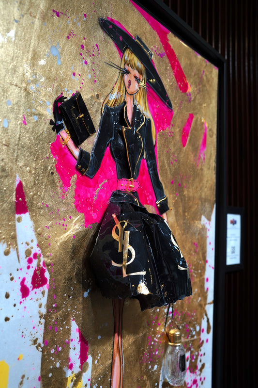 Rachel, stylist by trade, created her heroine more than 10 years ago. We call it ''La Parisienne'': The wavy hair, the dominance of gold by Gustav Klimt, the audacity of Toulouse Lautrec and the modernity of Edmond Kiraz have greatly influenced Rachel since her early childhood. Thanks to her creativity, Rachel thus composes three-dimensional works with a predominance for painting and recycling brand bags, perfume bottles from major brands such as Dior, Chanel, Hermès, Louis Vuitton, Gucci, YSL... of gold, pearls, flowers will come together under his brushstrokes to give unique works. Rachel is a popular French artist that the fashion world adores. Her works are present in the collections of major designers and international collectors.