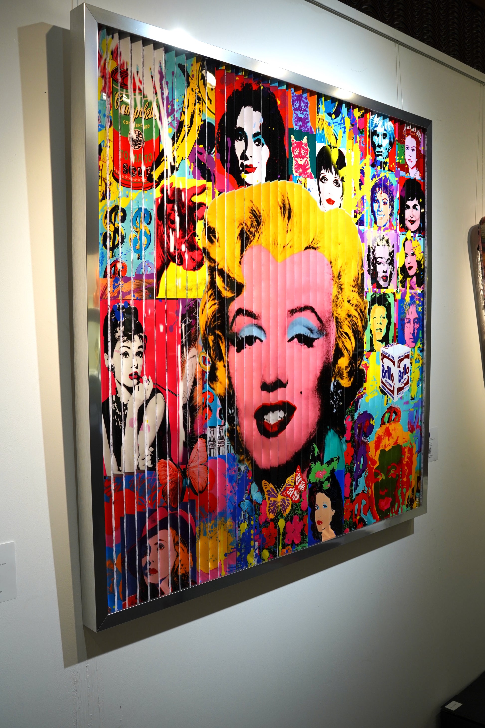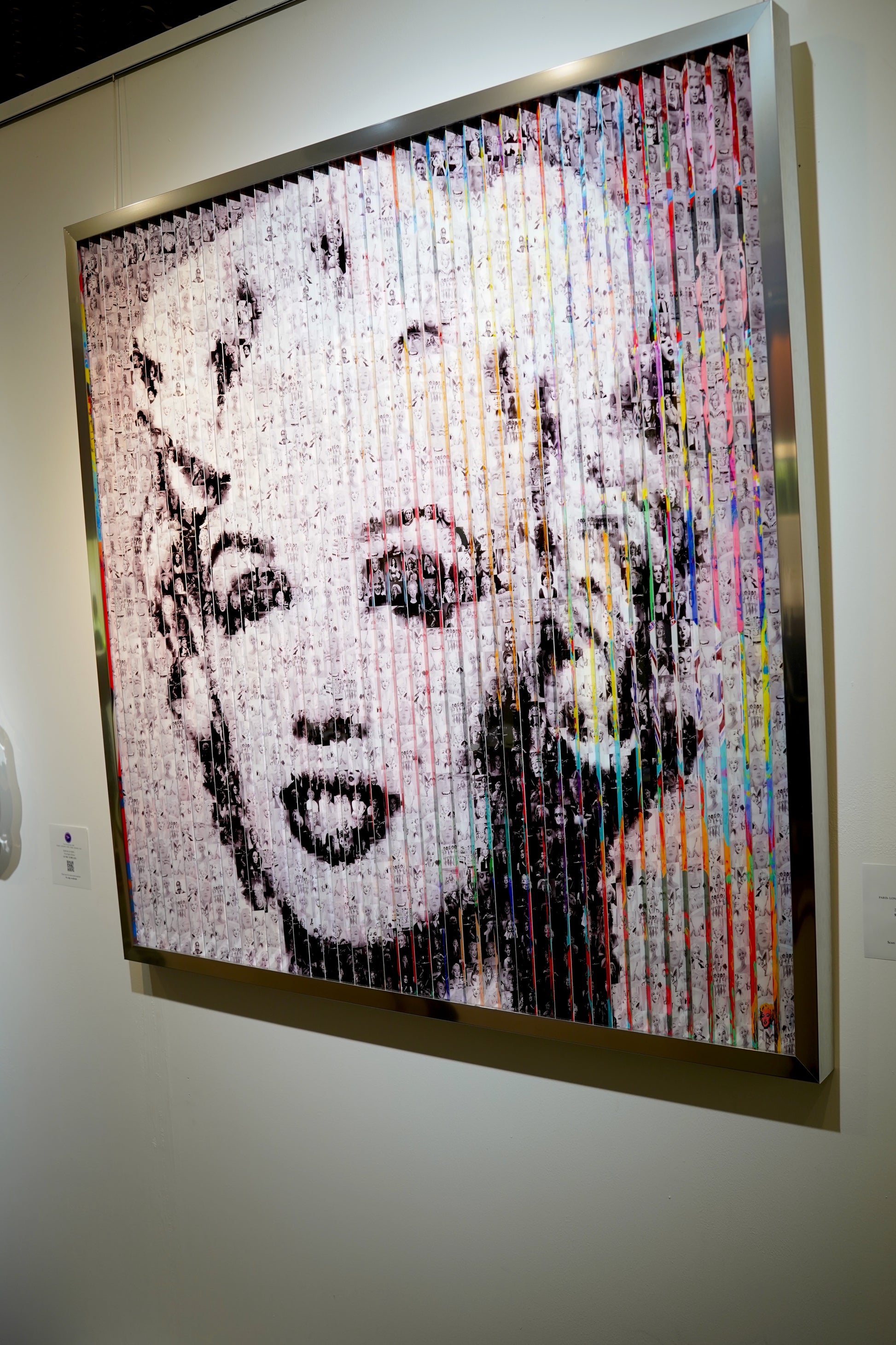 Her meticulous artistic process spans graphic design, metal printing, machining, and assembly, resulting in dynamic, two-part paintings that come alive through movement and perspective. Using double-printed metal plates cut into strips, her compositions reveal themselves fully only from certain angles, creating a playful sense of surprise.