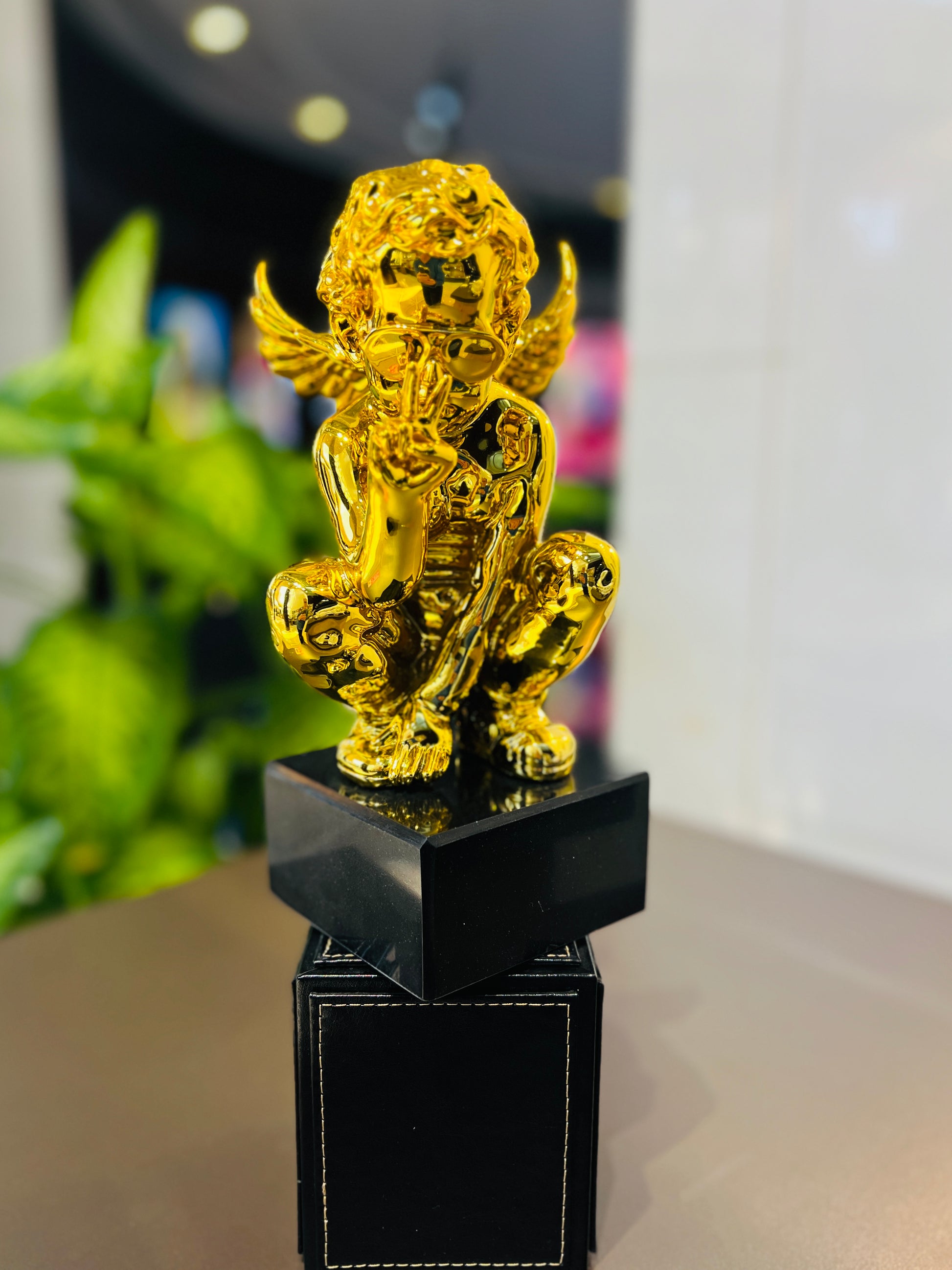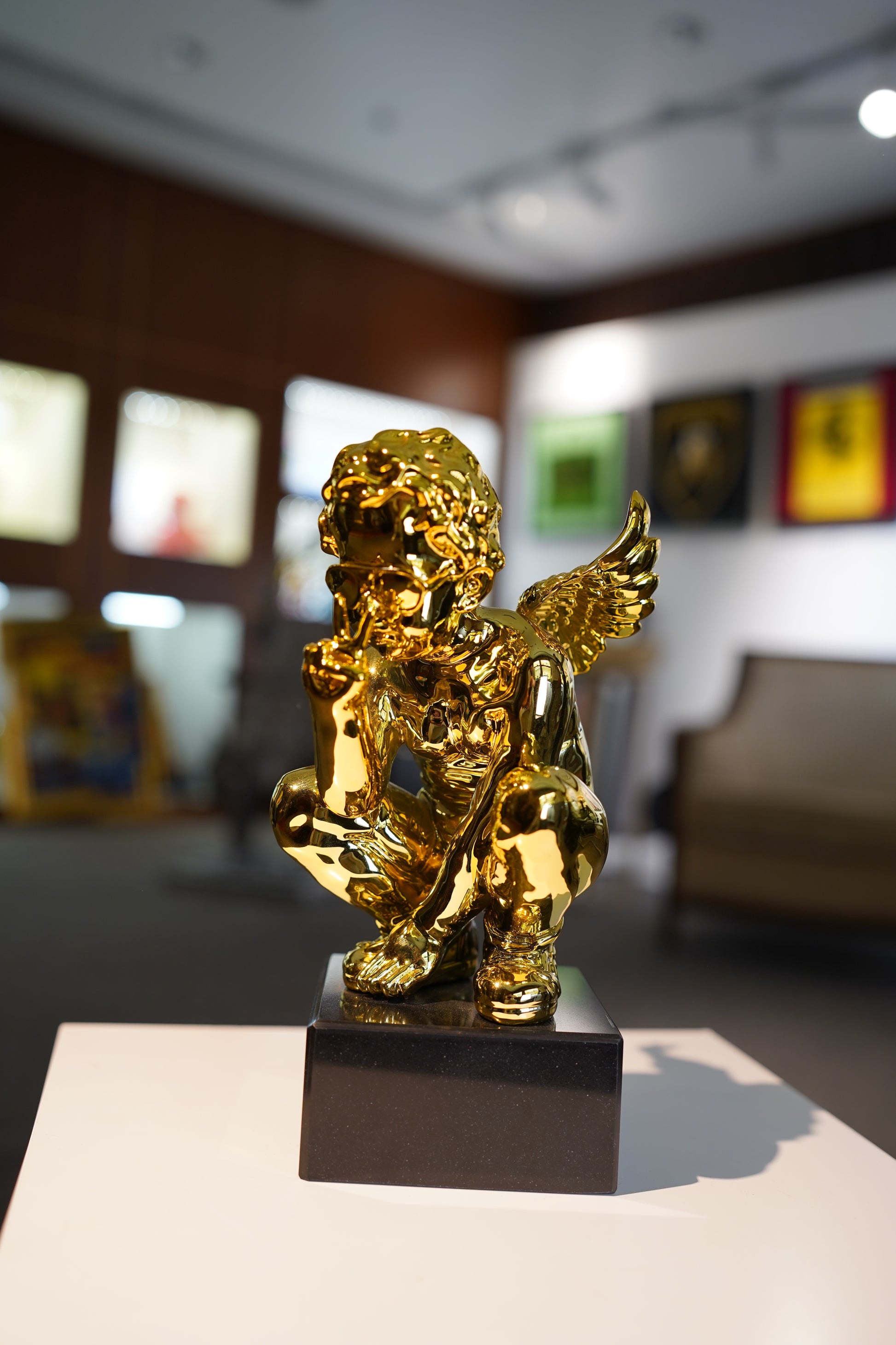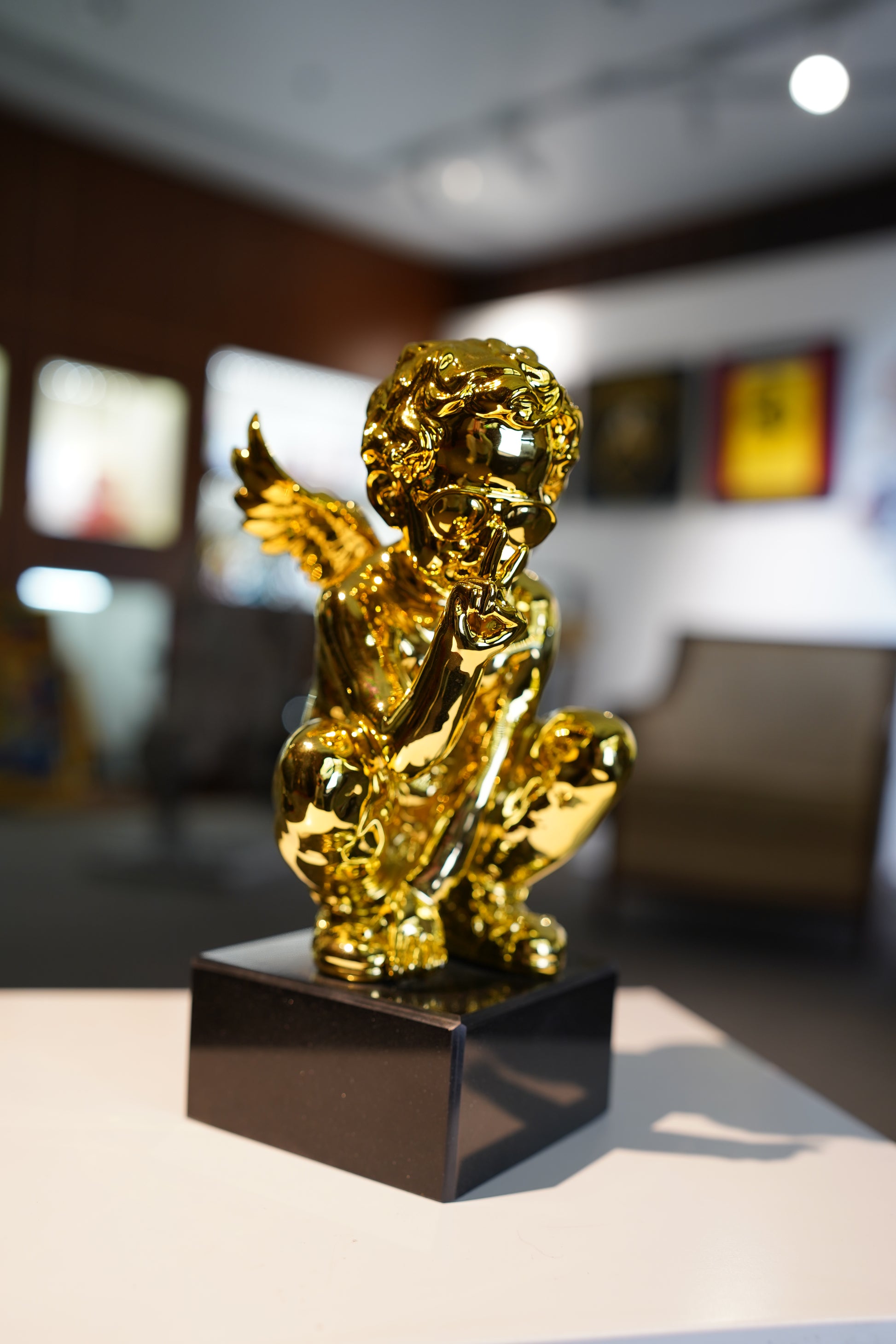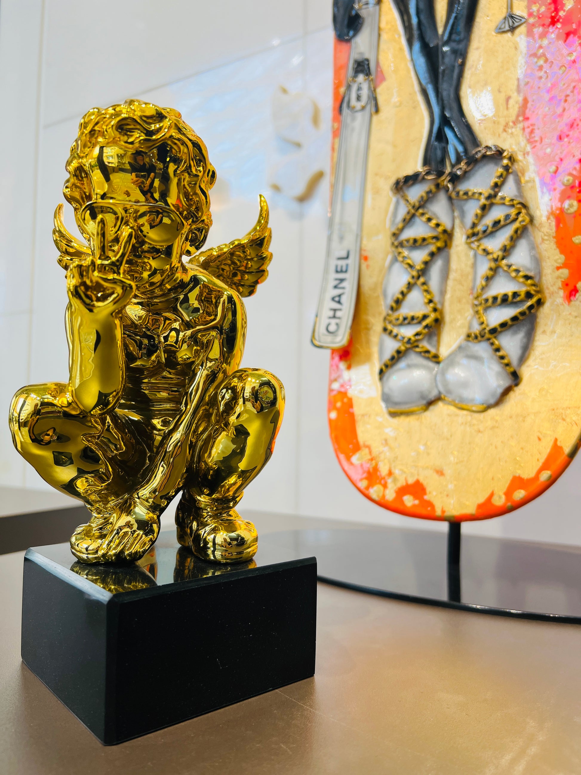Information about the artwork: Vivid punk stylings and pop-art icons mixed with luxurious opulence. Naughty Angels are quirky and bold, fun and daring. From Karl Lagerfeld riding a skate board to Frida Kahlo covered in parrots. All Angles are hand painted and completely unique. Made-to-order and fully customisable. It takes 6 weeks to create an Angle in their West London workshop.