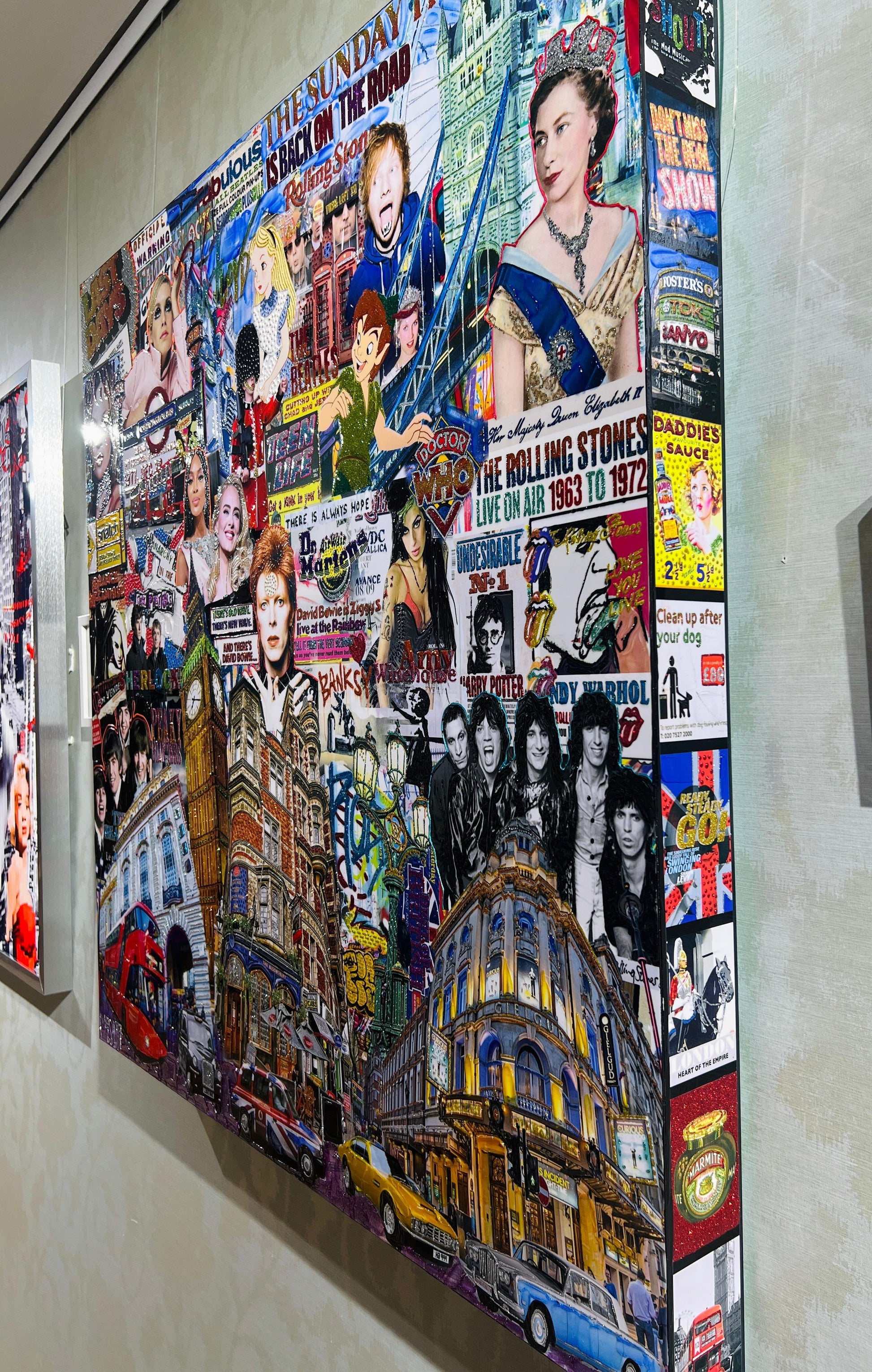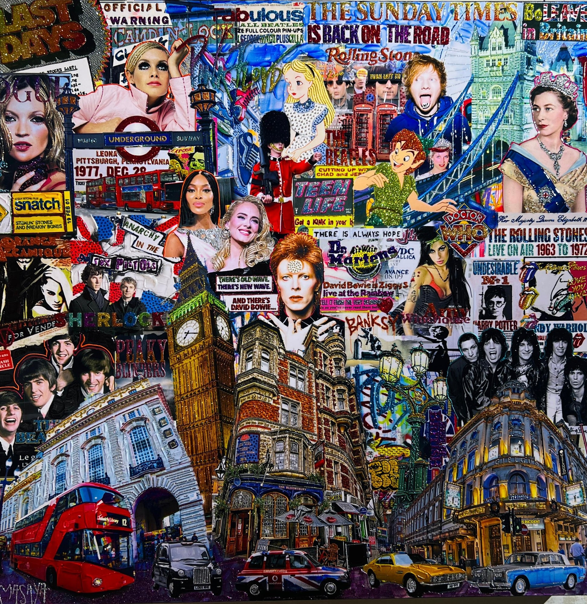 Combining acrylics, metallic and iridescent resins, photographs, and graphic elements, Masaya crafts neo-Pop Art interpretations of contemporary cities. New York celebrates Warhol and Basquiat, London echoes punk culture and iconic pubs, while Tokyo reflects the fusion of tradition and modernity. Through glittering materials, relief effects, knife strokes, glass, and mirrors, his works transform into striking, one-of-a-kind creations.