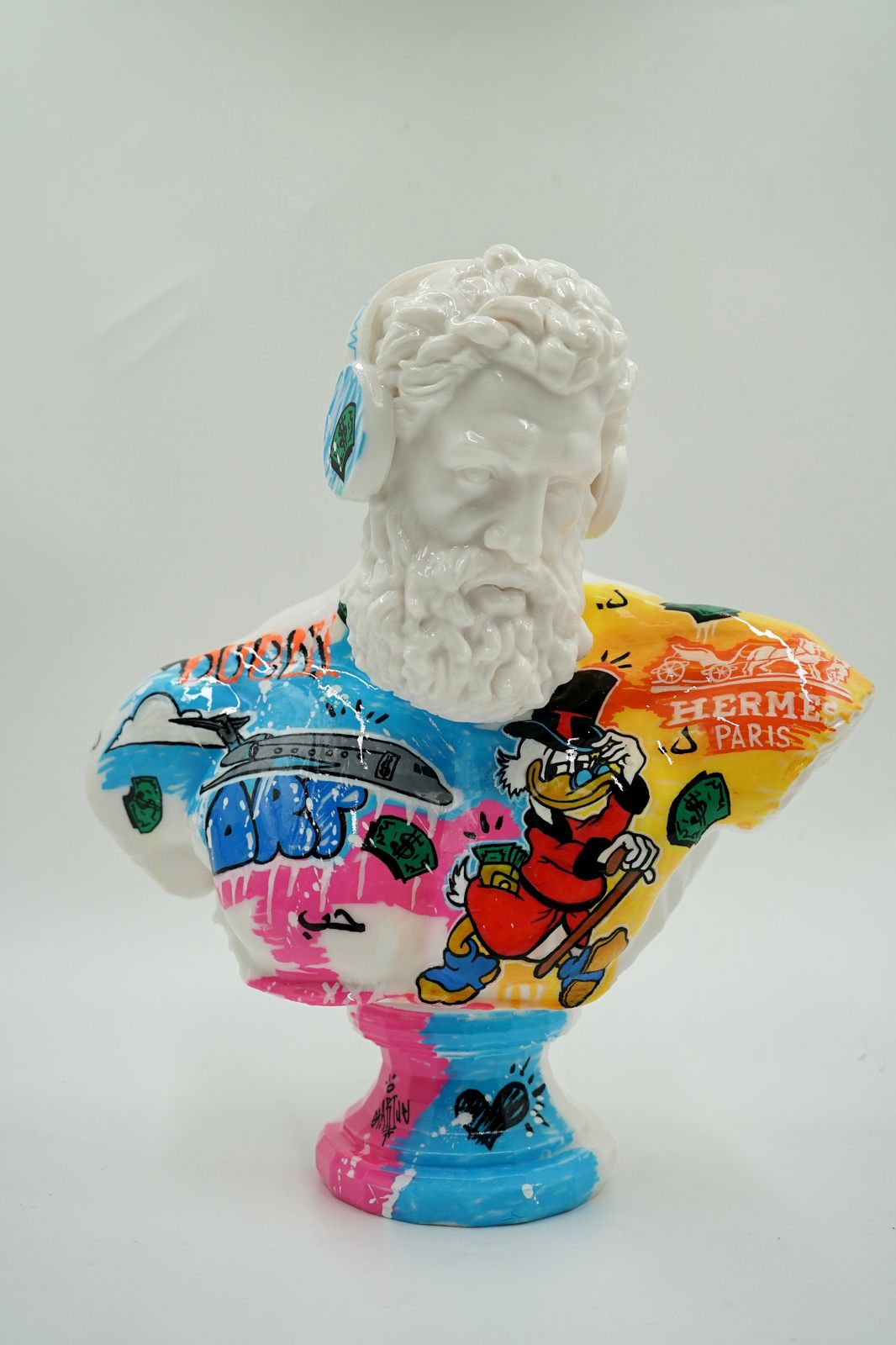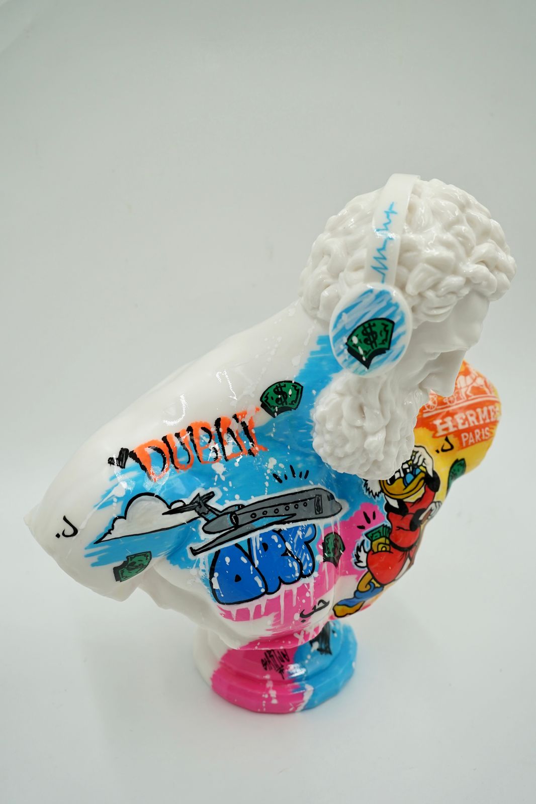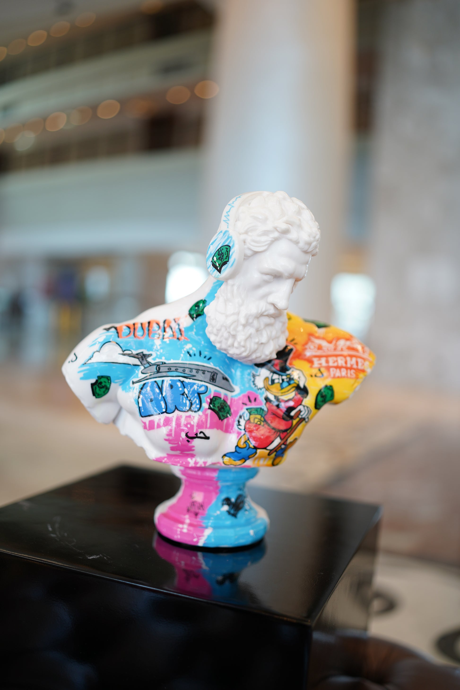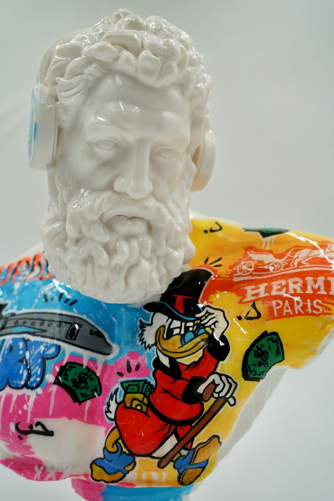 Information: Michail, born in Greece in 1992, has developed different techniques over the years. He works mainly with alabaster sculptures, sprays and markers, creating colorful works of art full of contrasts - not only visually, but also in their meaning. Whether painting or sculpture, Michail takes these great examples of Greek beauty norms and adds a twist to our modern culture. With spray paint and markers, he covers ancient deities with symbols, signs and labels that reflect today's cultural "obsessions" - what 21st century culture thinks and dreams about. His mode of expression depicts the transformation of our world and, transforming the statues of ancient Greece into a new art, clearly shows the lack of order in the new world. Michail lives and creates on the island of Mykonos.