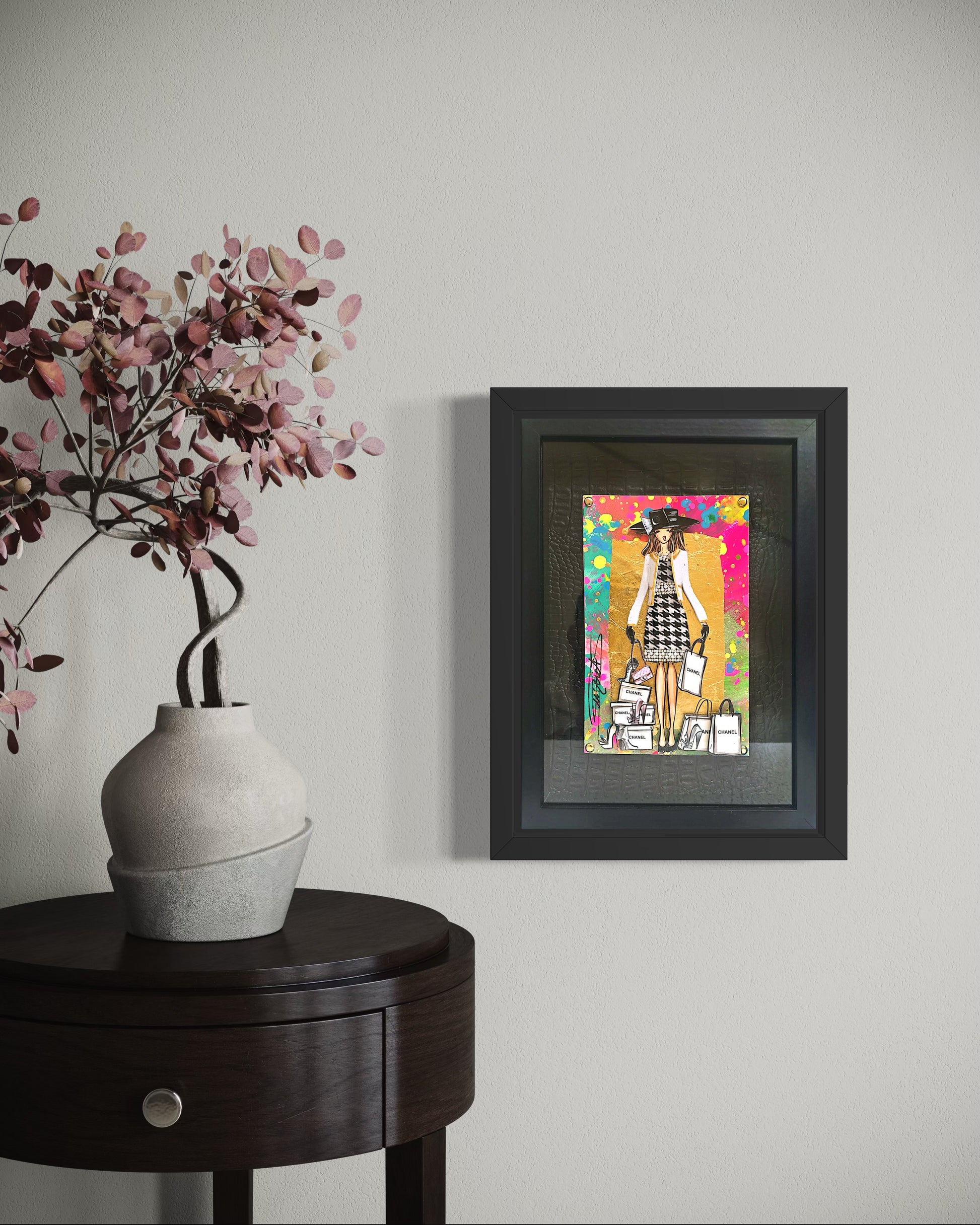Information : Rachel, stylist by trade, created her heroine more than 10 years ago. We call it ''La Parisienne'': The wavy hair, the dominance of gold by Gustav Klimt, the audacity of Toulouse Lautrec and the modernity of Edmond Kiraz have greatly influenced Rachel since her early childhood. Thanks to her creativity, Rachel thus composes three-dimensional works with a predominance for painting and recycling brand bags, perfume bottles from major brands such as Dior, Chanel, Hermès, Louis Vuitton, Gucci, YSL... of gold, pearls, flowers will come together under his brushstrokes to give unique works. Rachel is a popular French artist that the fashion world adores. Her works are present in the collections of major designers and international collectors.