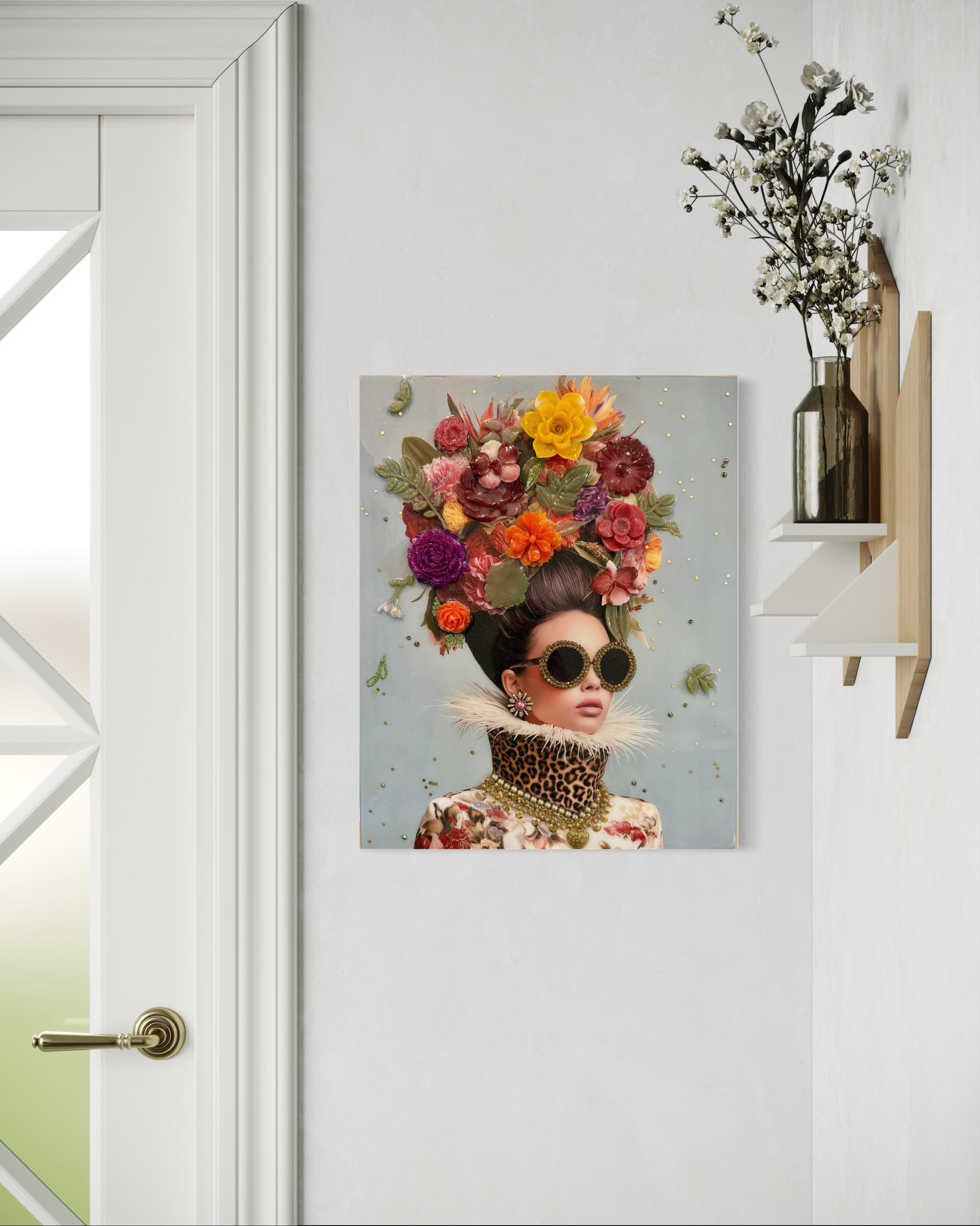 Technique: mixed media: digital images with paint, and then collage of materials such as beads, crystals, sequins, fabric, and flowers (handmade with castings of resin). Resin is added as a topcoat. - All is handmade