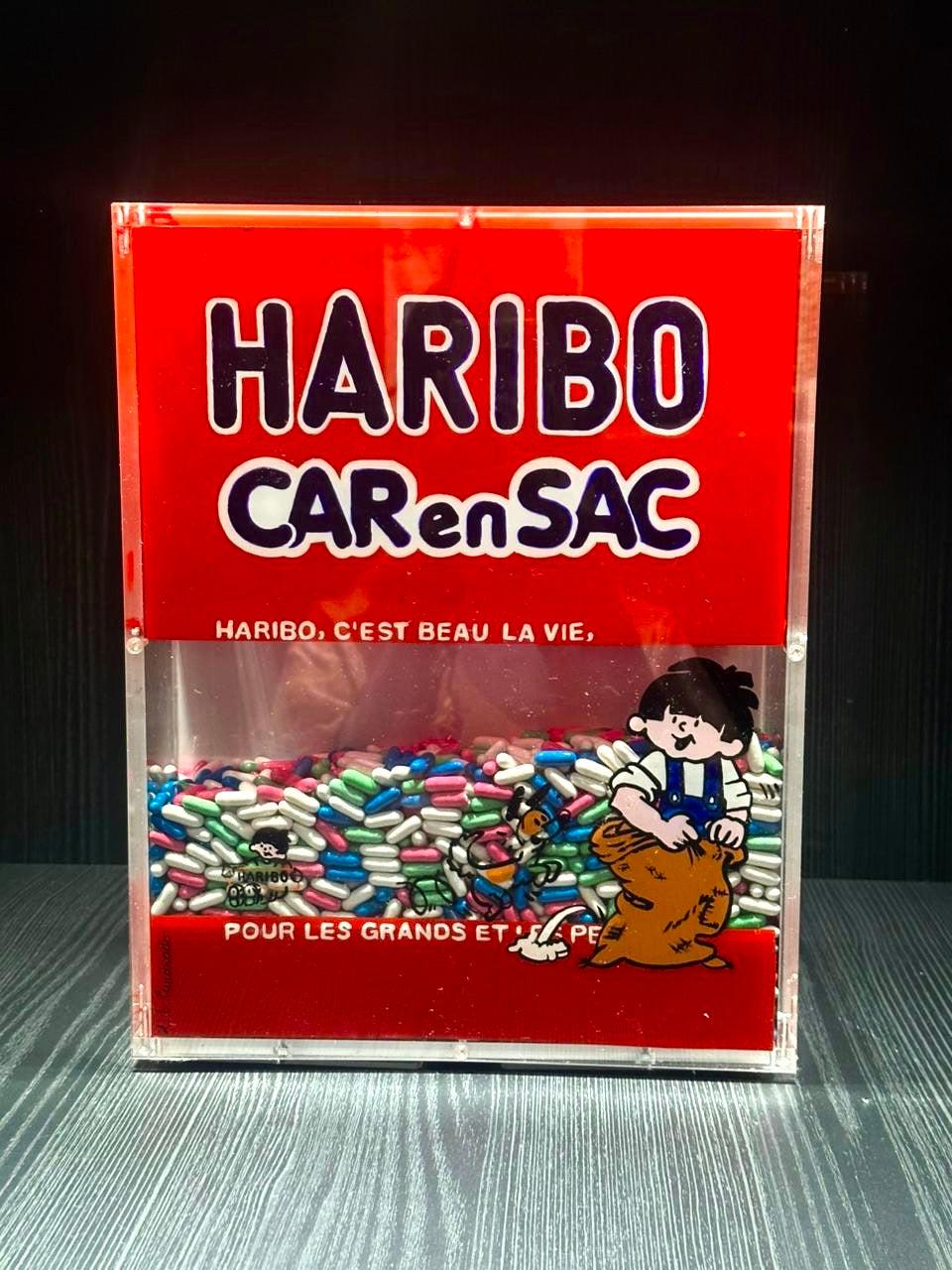 The image and memory of these products and brands is an actual echo to our child’s remembrances and an appeal to our taste buds : Coca-Cola, Hollywood chewing-gum, Tagada strawberries, Car en Sac, Marshmallows, Haribo Dragibus, Carambar, Malabar, Krema candies, Danone etc…