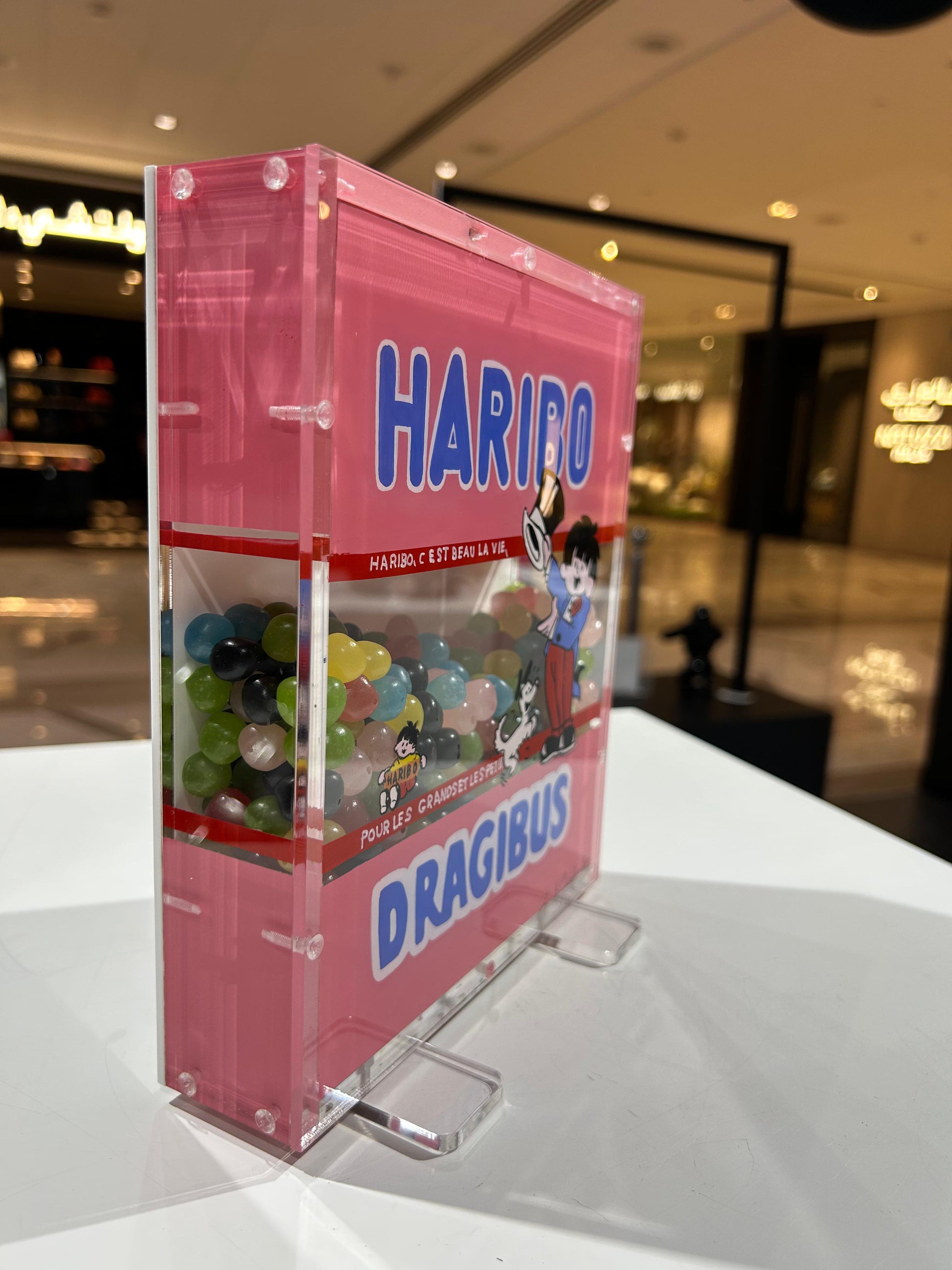 The image and memory of these products and brands is an actual echo to our child’s remembrances and an appeal to our taste buds : Coca-Cola, Hollywood chewing-gum, Tagada strawberries, Car en Sac, Marshmallows, Haribo Dragibus, Carambar, Malabar, Krema candies, Danone etc…