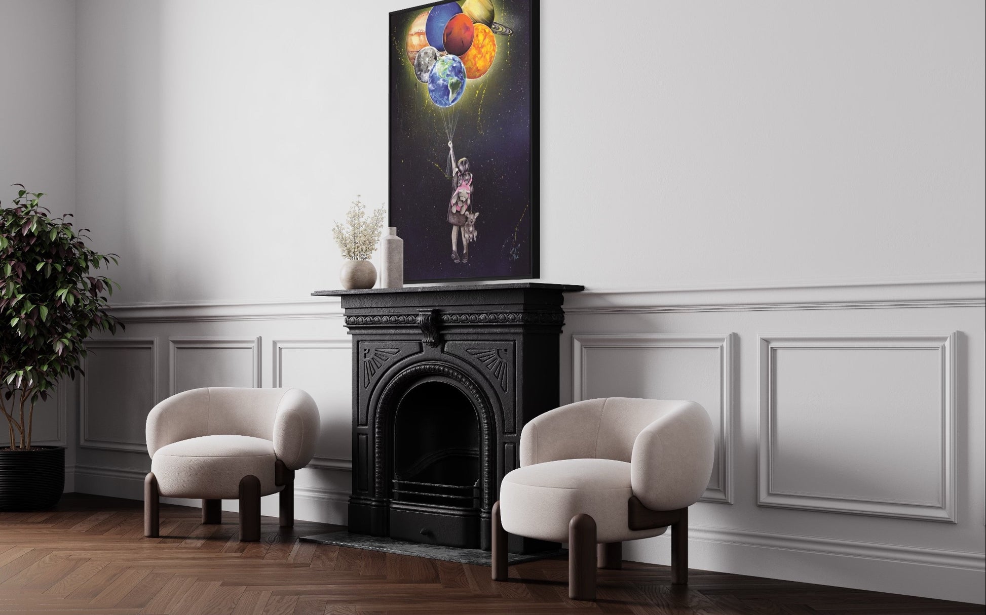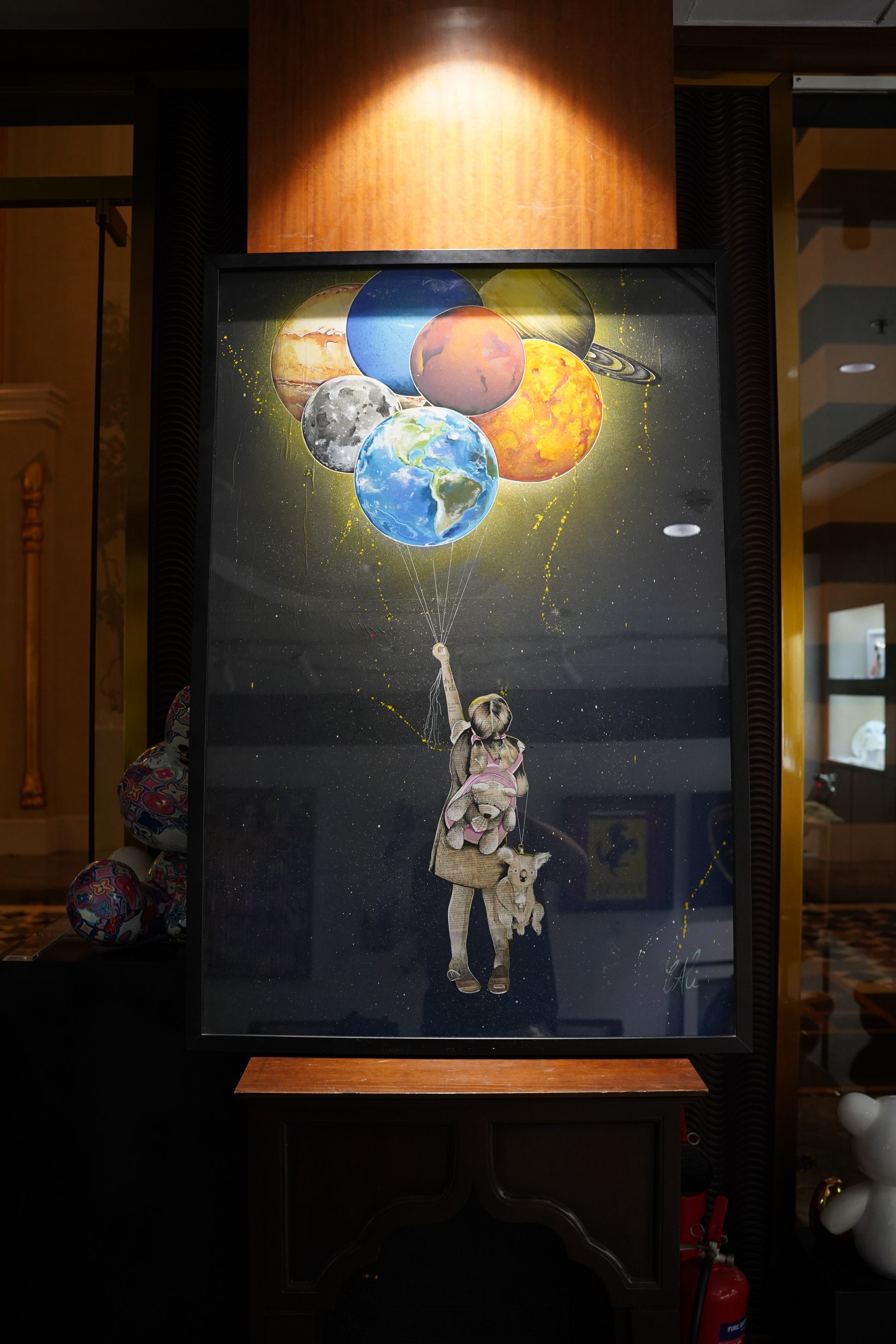 Information about the Artwork: Using her Bic, the French artist Cali takes this little girl to another, more harmonious planet. A nod to the fires that ravaged Australia in 2019, the kangaroo will be on the trip. the big idea is the communication: the planets attached by strings are the symbol of hope that we can make any world a better place if we see it through the Child innocence: a positive and encouraging view that longs to be heard."