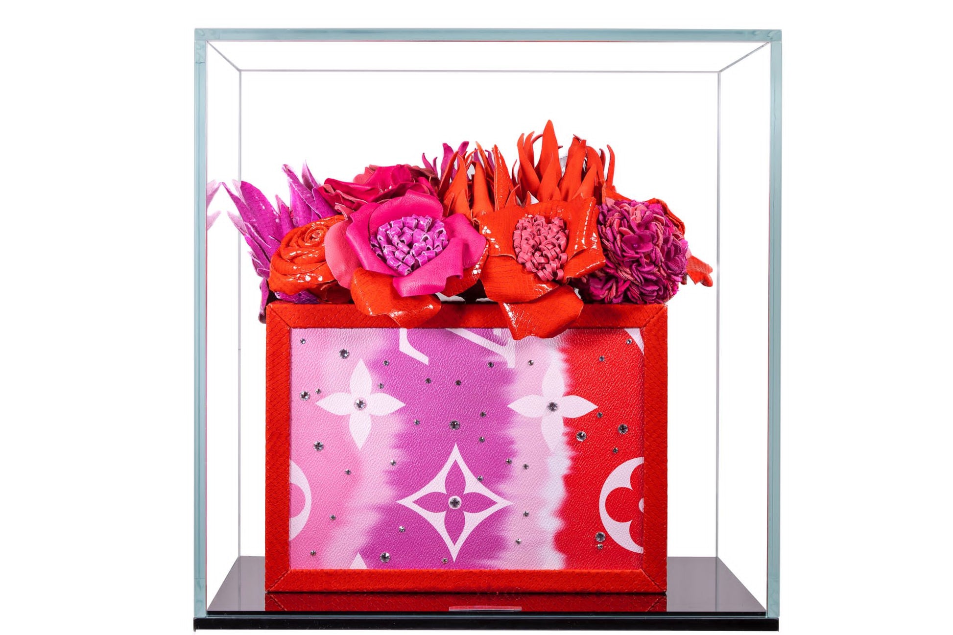 Technique : Leather box, leather eternal flowers. The flowers are hand handled and hand cut. They are all unique pieces made with high quality Italian Leather. The Flowers are made according to various modeling techniques. They are sealed in the box through epoxy resin. Mirror and wood base. Clear glass showcase.