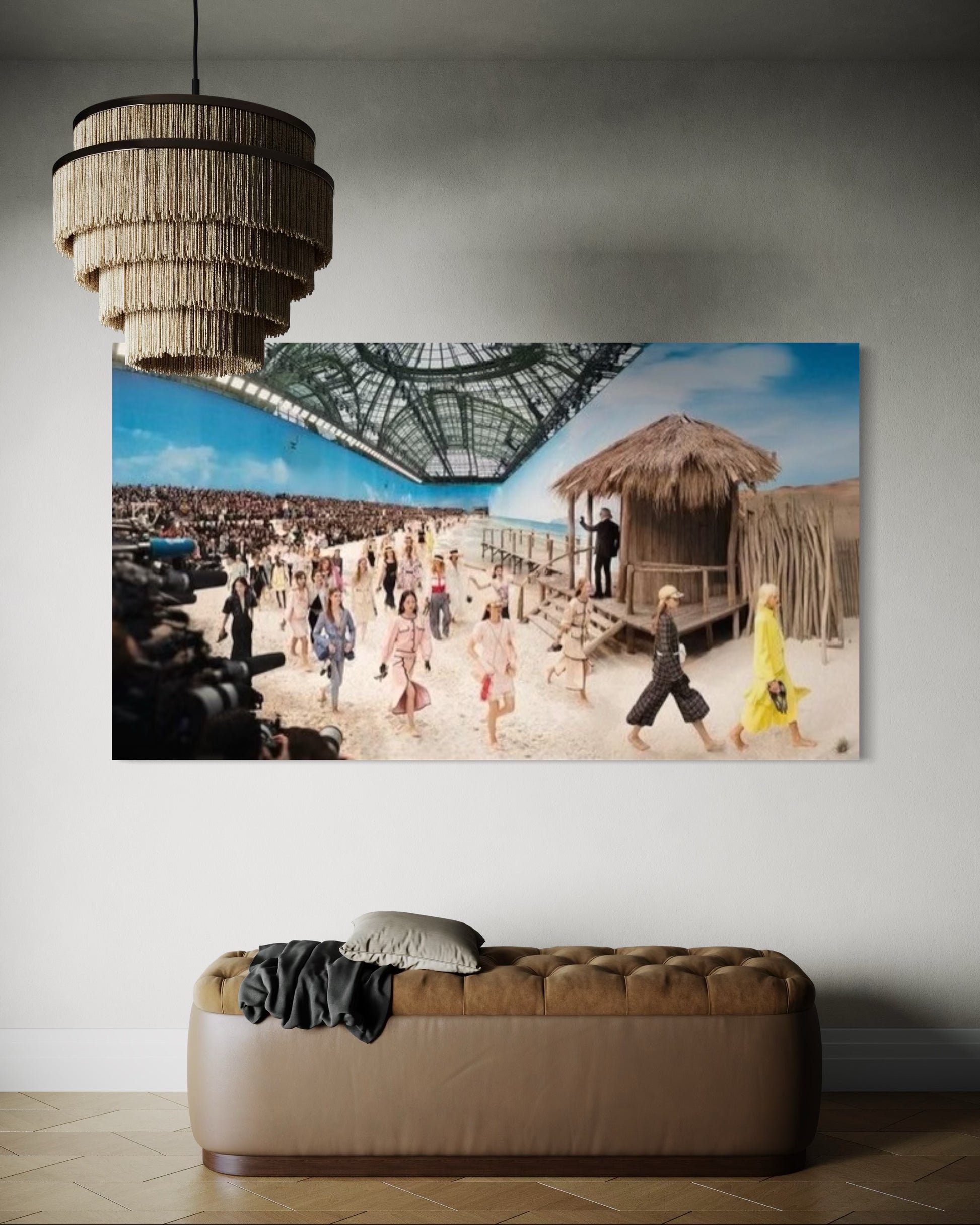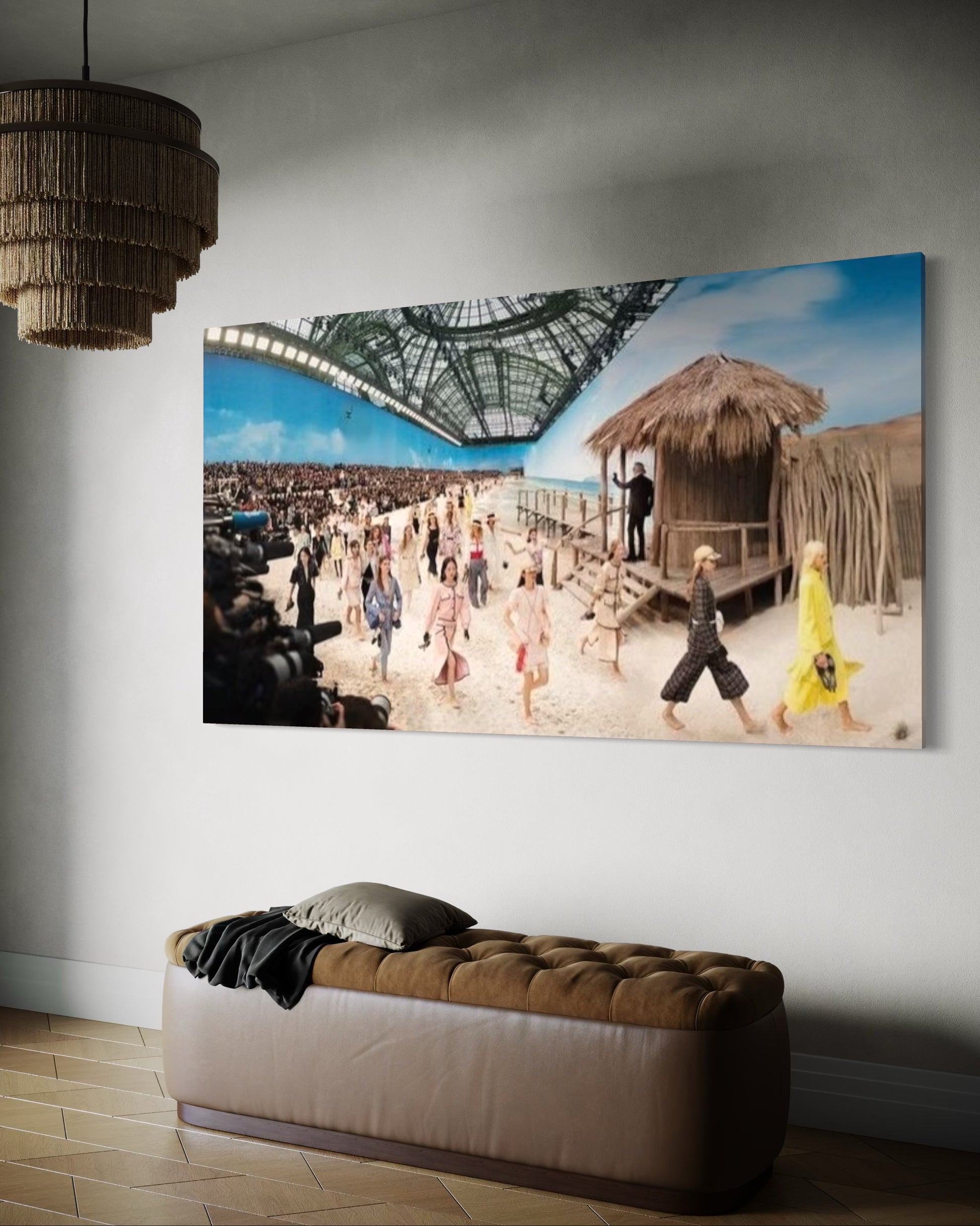Information about the artwork: Chanel transformed the Grand Palais into an ocean liner for its Cruise 2019 show. Karl Lagerfeld took guests on a trip to the beach, creating an entire beach nearly as good as the real thing.Guests were seated on the sand, on top of wood pallets, to see the models saunter across the sand in time with the real waves under the watchful gaze of Chanel’s lifeguards. A set that mimicked reality, you could almost forget Paris’ grey skies under the blue sky with your feet in the sand.