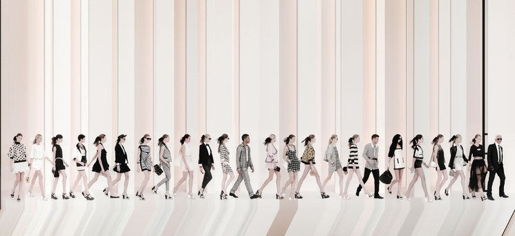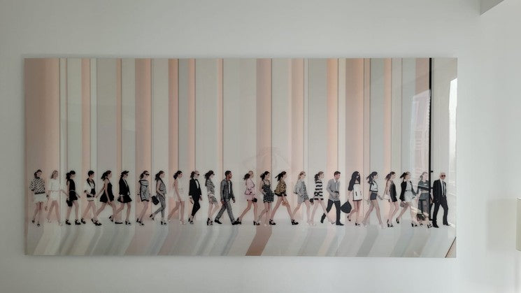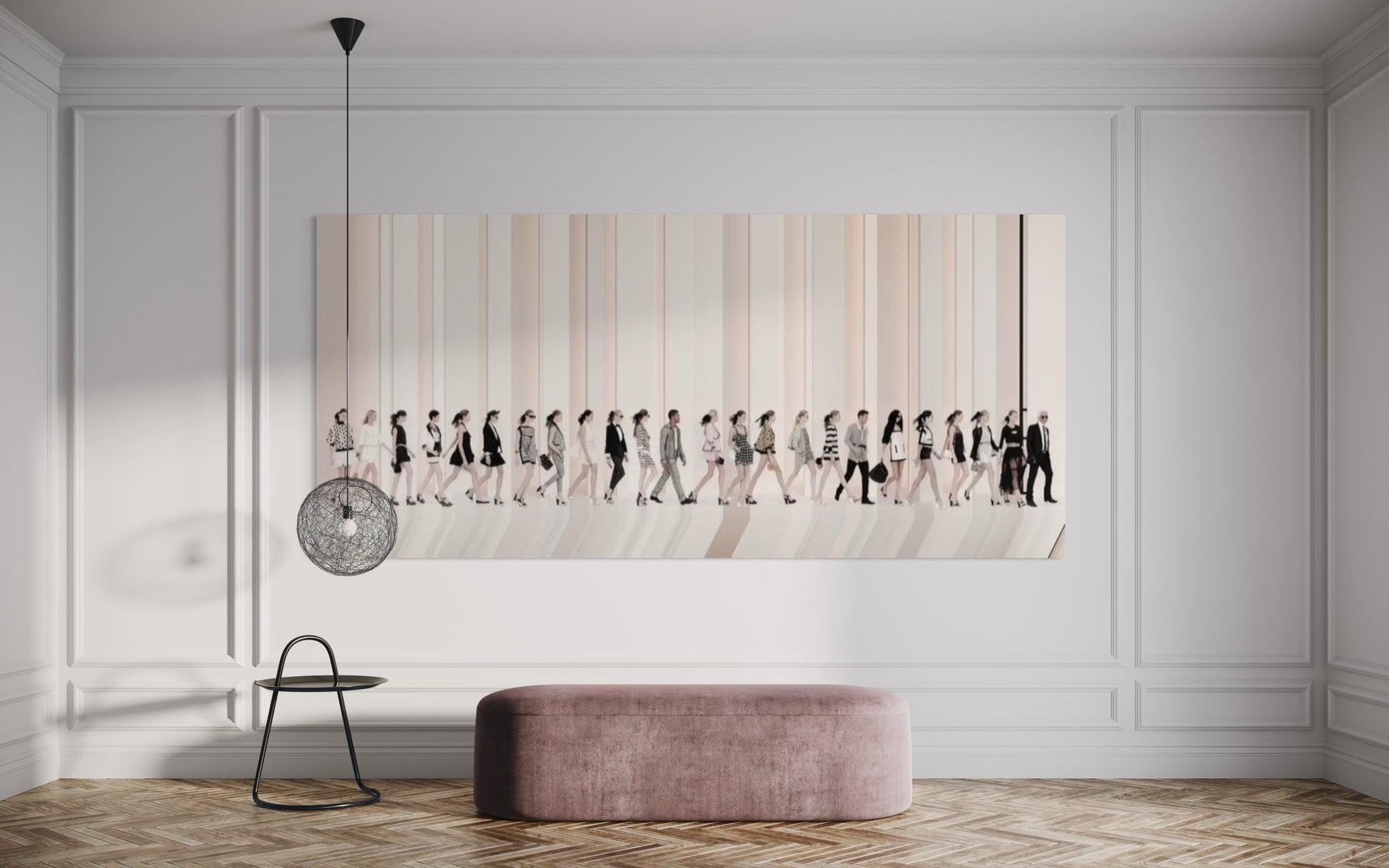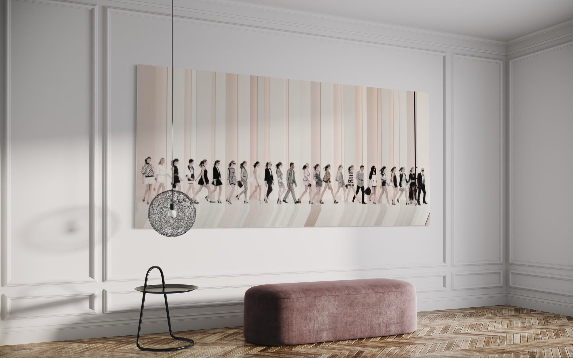 Information about the artwork: The show conceptually was really interesting, a central space opened up to reveal the creative team (hair, make up) who helped make it all happen. But for me there was no defining image I could use. This was the first time I decided to rebuild the show almost completely from scratch. Using one single view point I shot the models as they passed. It then took several weeks to position and correct, to give at least some illusion that they were all part of the same image.