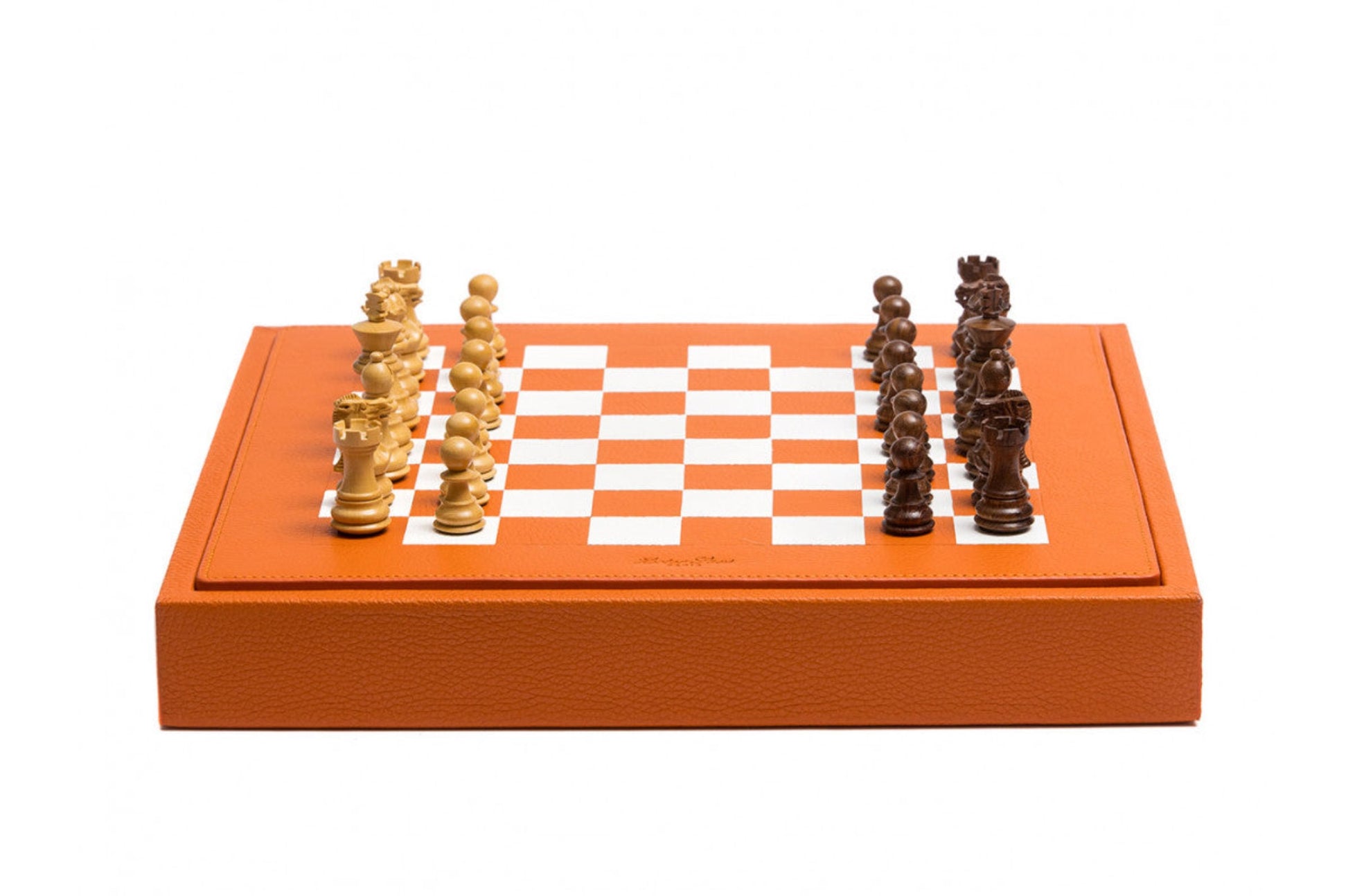 Information about the Chess Box : For more than forty years, the brand has been imagining unique, very designer pieces made of noble materials. More than a game, the chess set stands as a true design item. Its removable board hides the storage space for the pieces. These are harmoniously matching with the set, which is entirely leather-wrapped."