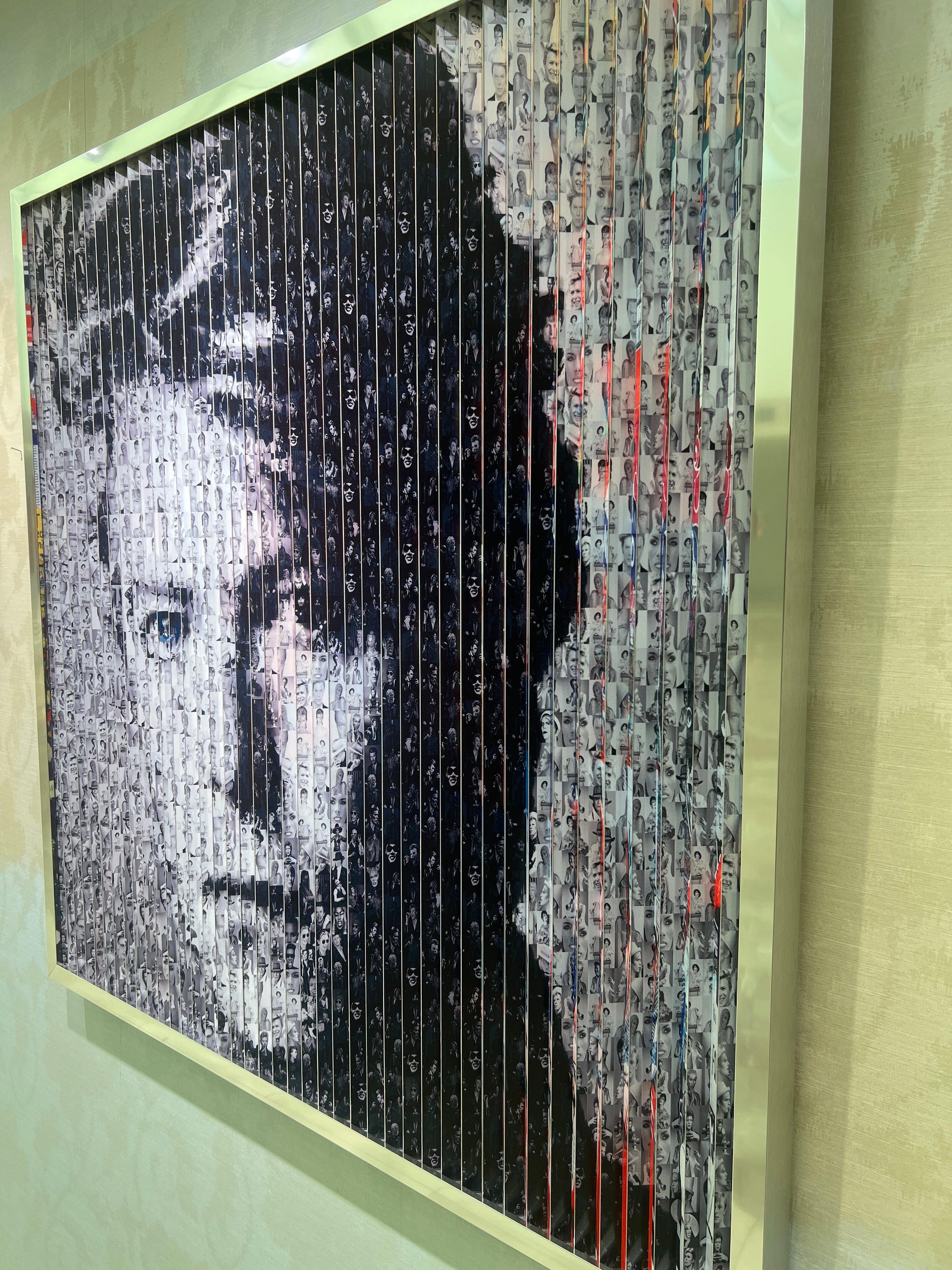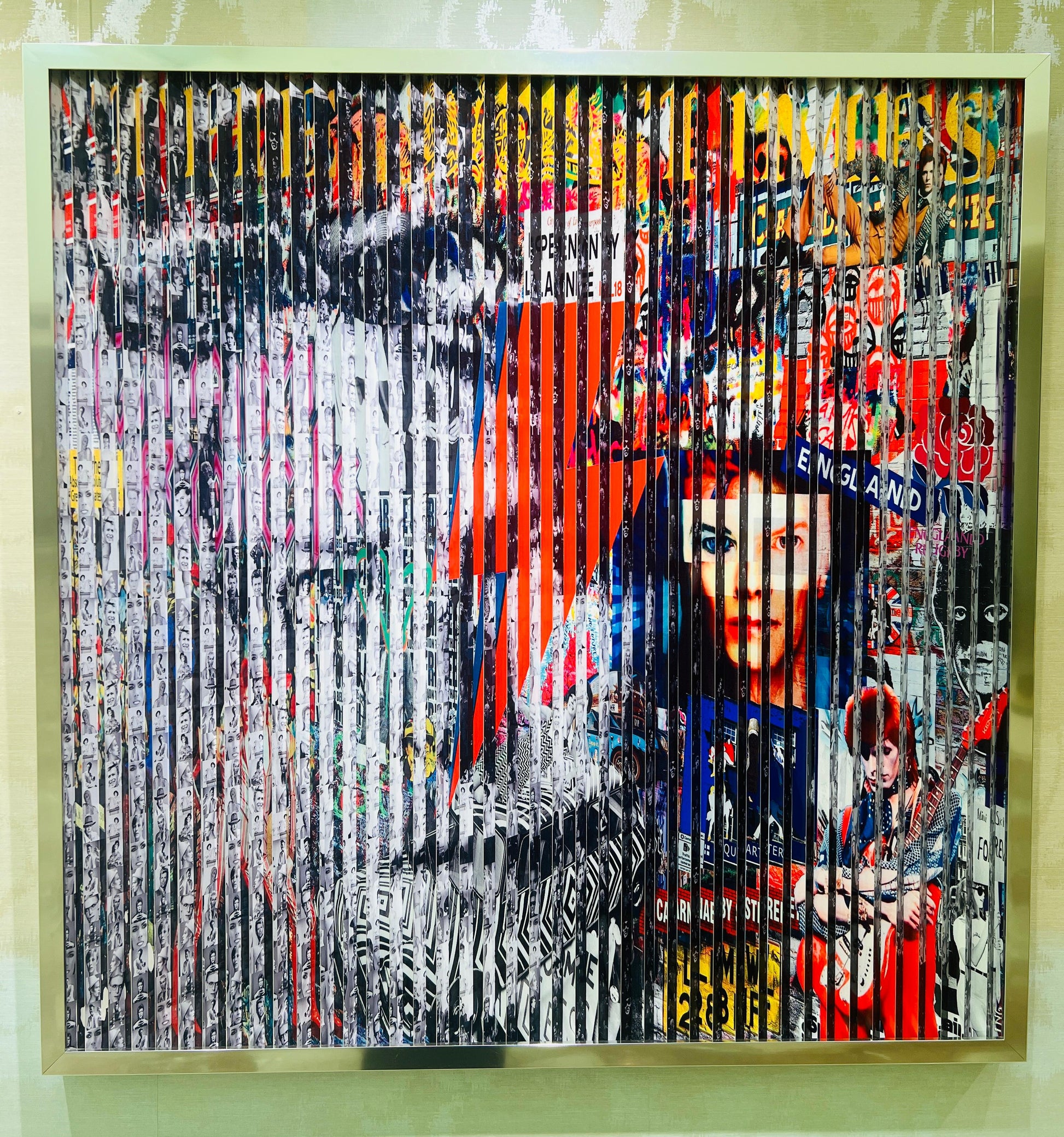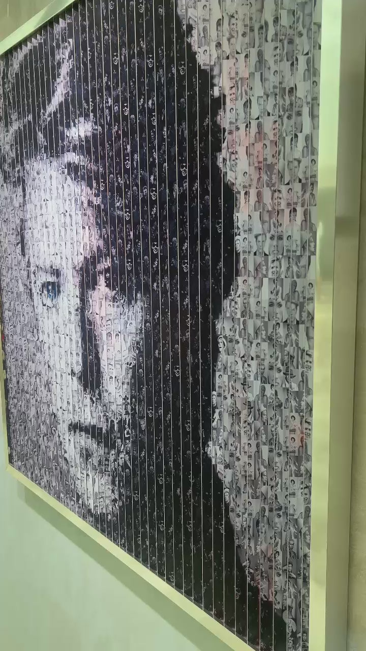 Her meticulous artistic process spans graphic design, metal printing, machining, and assembly, resulting in dynamic, two-part paintings that come alive through movement and perspective. Using double-printed metal plates cut into strips, her compositions reveal themselves fully only from certain angles, creating a playful sense of surprise.