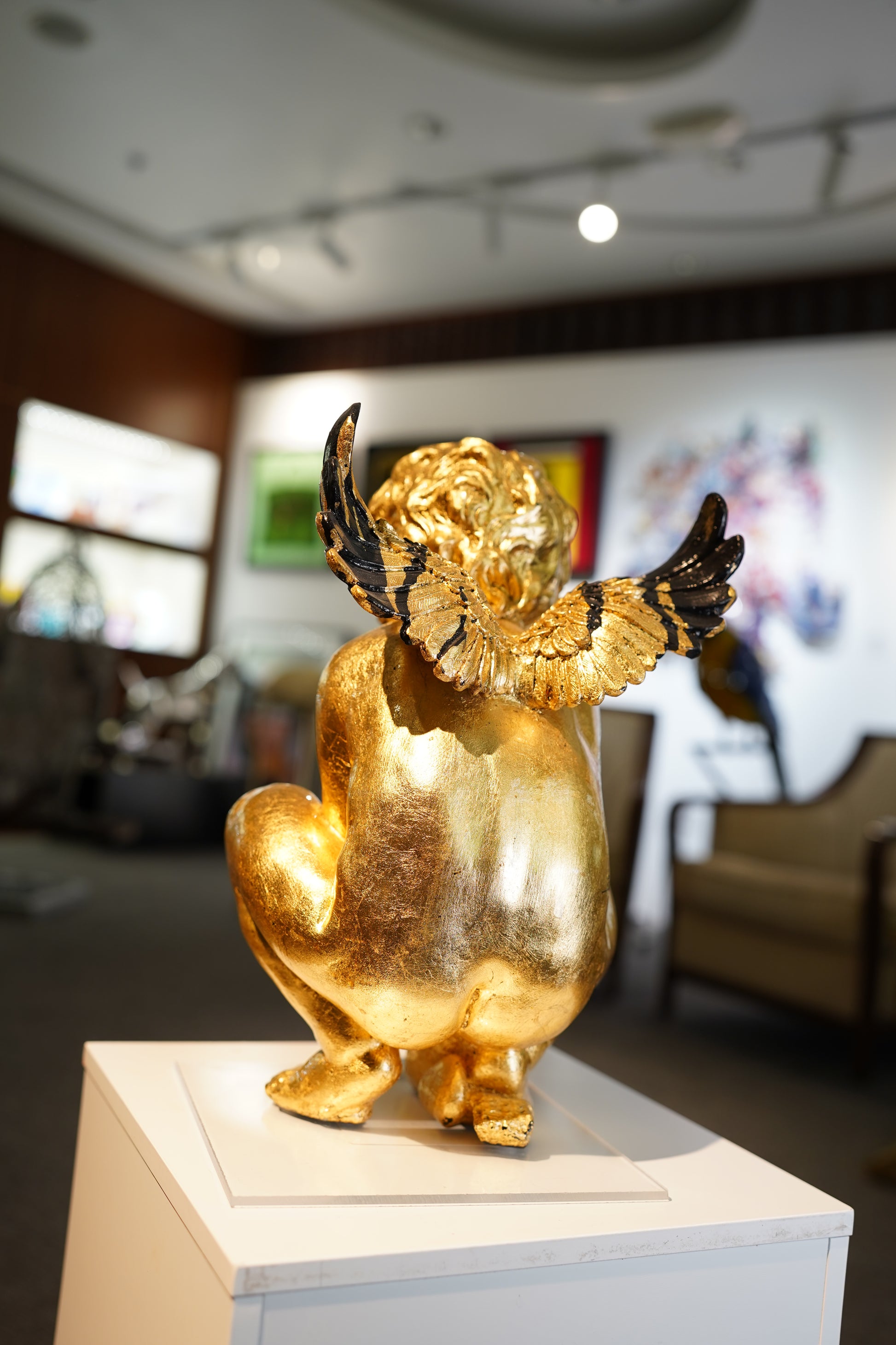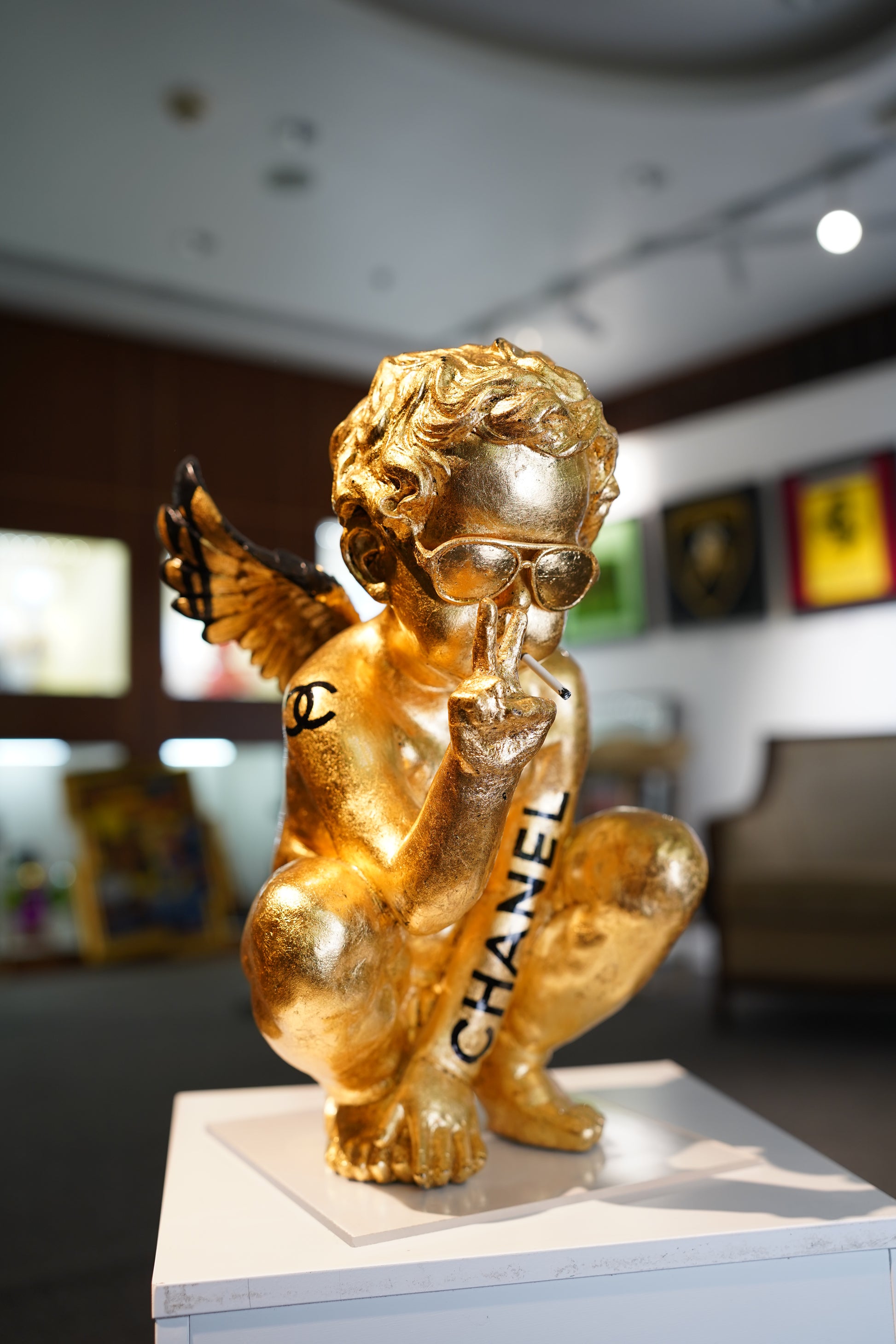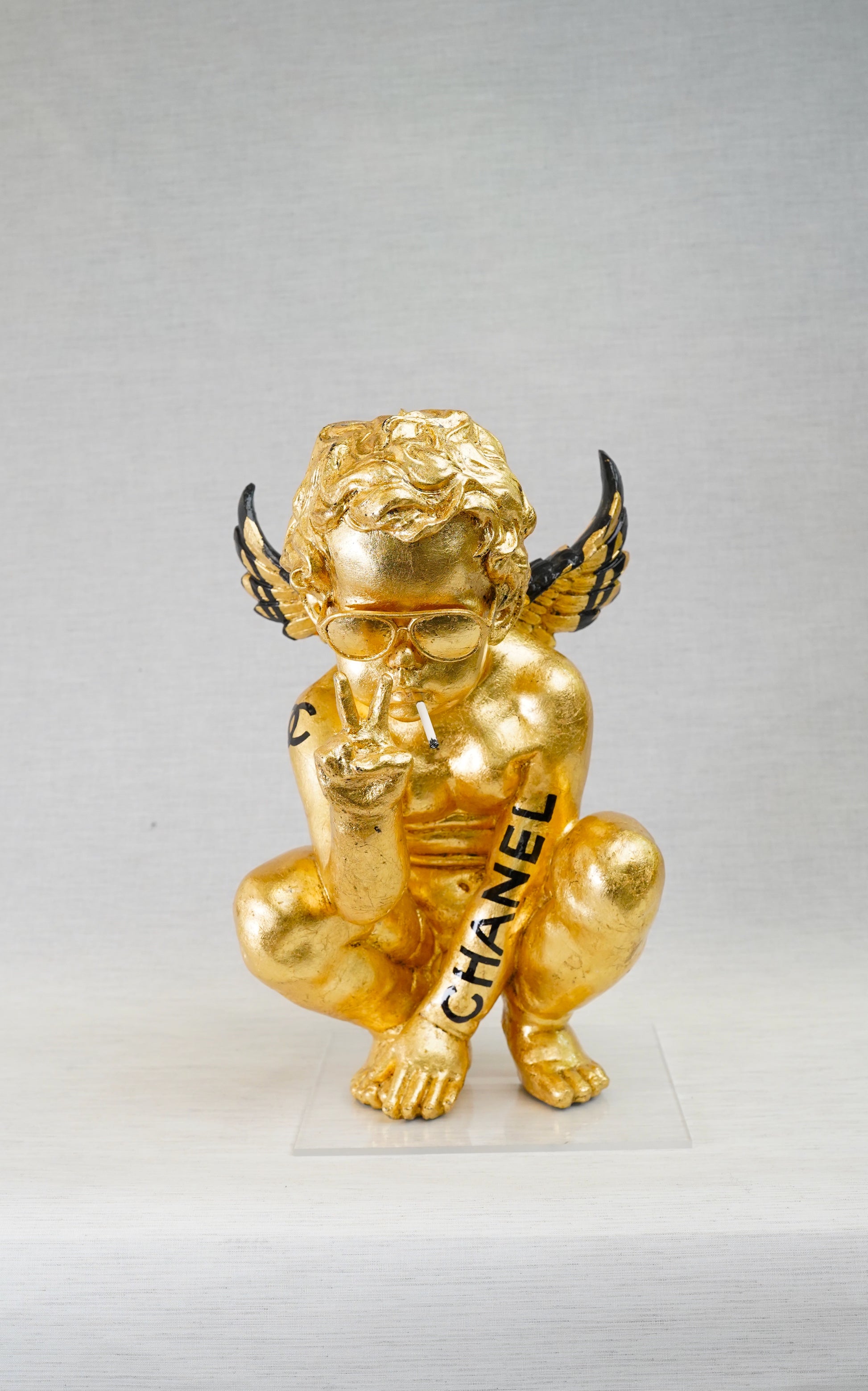 Information about the artwork: Vivid punk stylings and pop-art icons mixed with luxurious opulence. Naughty Angels are quirky and bold, fun and daring. From Karl Lagerfeld riding a skate board to Frida Kahlo covered in parrots. All Angles are hand painted and completely unique. Made-to-order and fully customisable. It takes 6 weeks to create an Angle in their West London workshop.