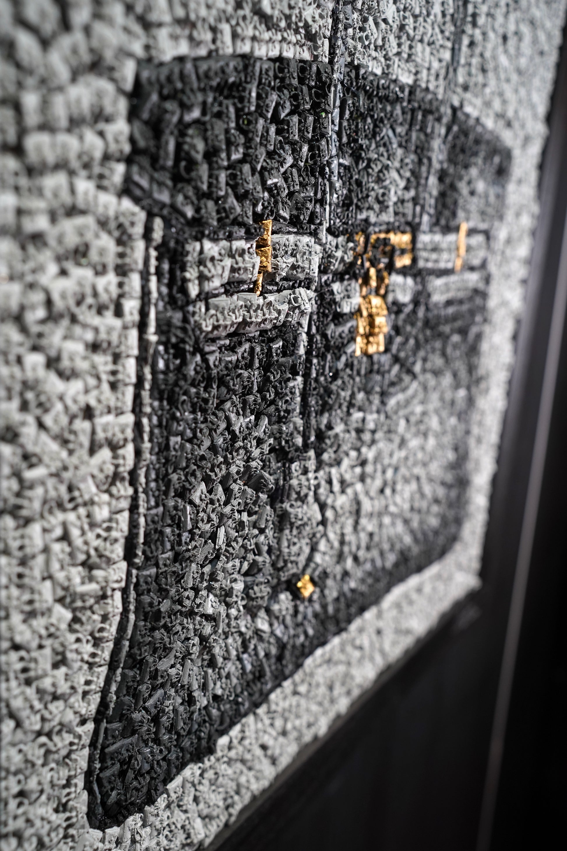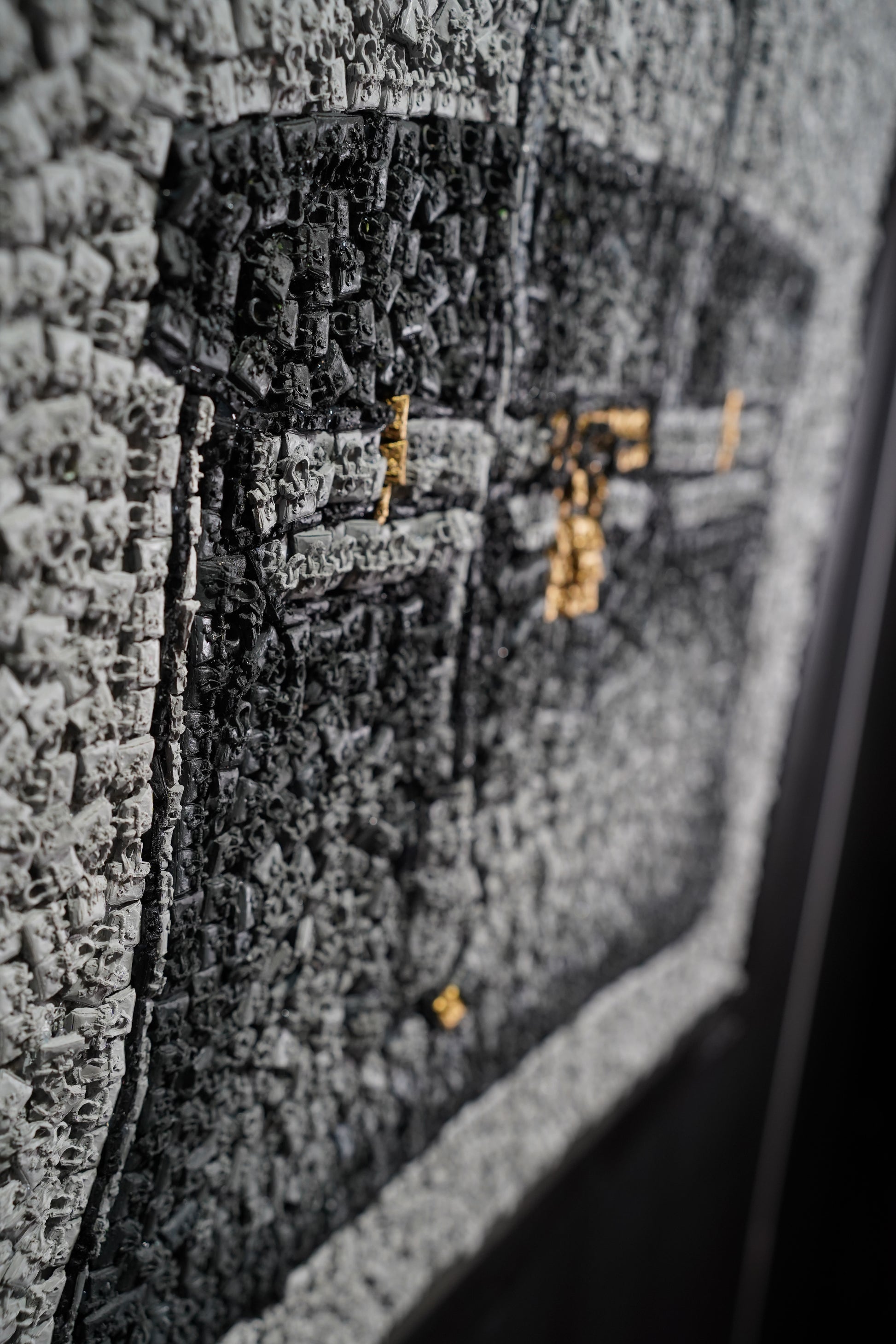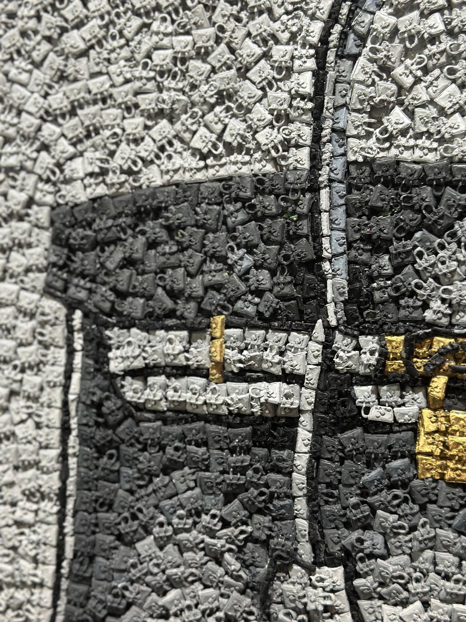 Information about the artist: Kevin Champeny is a famous sculptor known for his large, textured hanging mosaics composed of thousands of small objects such as gummy bears and miniature skulls, which form photorealistic images when viewed from afar. Born and raised in Beloit, Wisconsin, he studied Art History and Education at Beloit College, earning a bachelor's degree in studio art. After moving to New York City, his art career took off in 2016 while he was working as a mechanic at an aviation company. He has worked as a contract sculptor for major brands including Warner Brothers, Disney, Patron, and Calvin Klein, and notably created the master model for President Obama’s cereal bowl. Champeny creates pieces for museums, private commissions, and galleries.