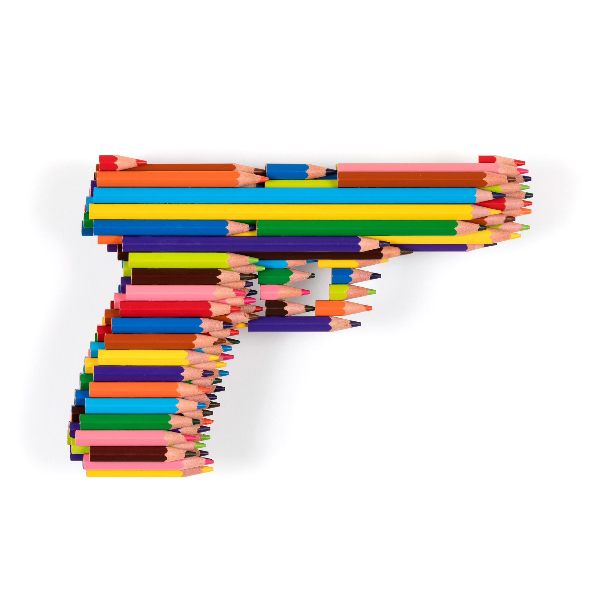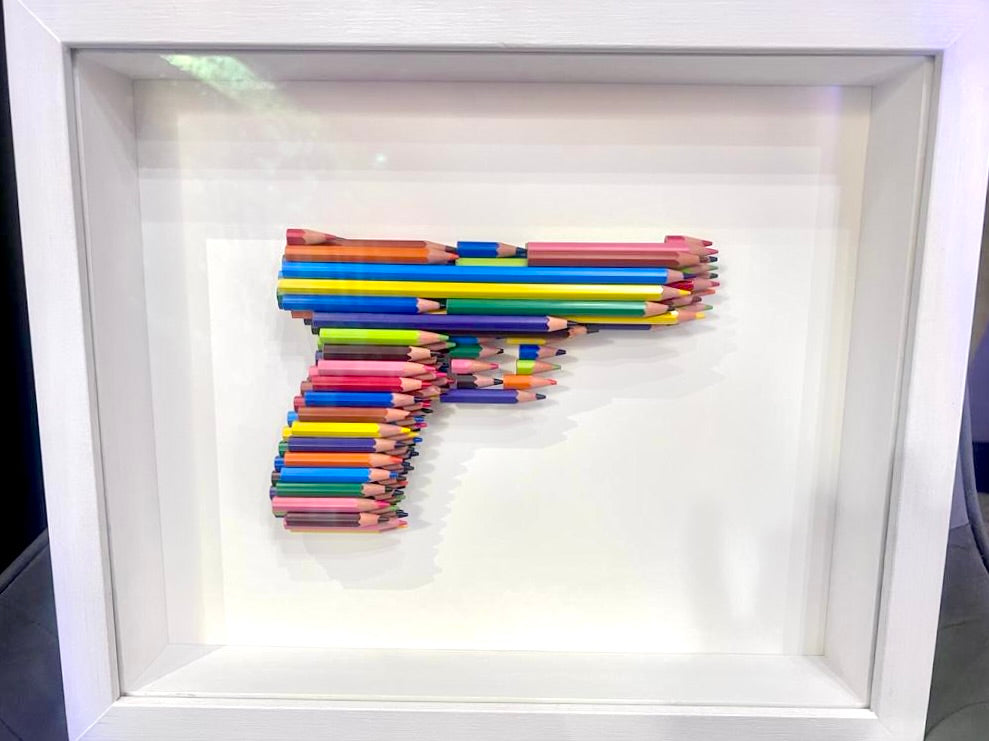 With sharp British humor, his exhibition A Consumer Product critiques the flaws of modern society through collage, sculpture, and painting. Newton transforms everyday materials—grocery packaging into skulls, pencils into guns, hearts into blades—playfully reassigning meaning to the banal.