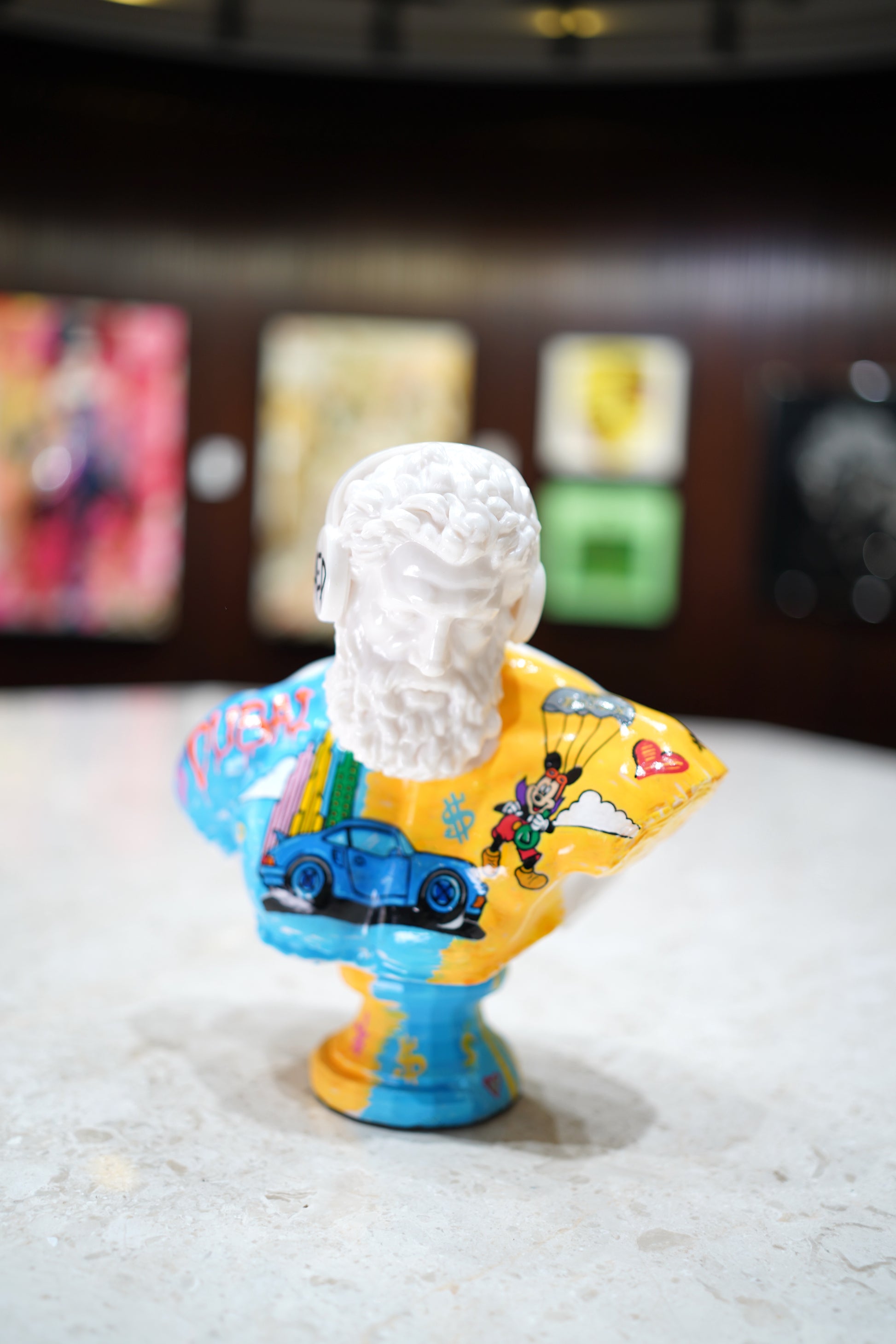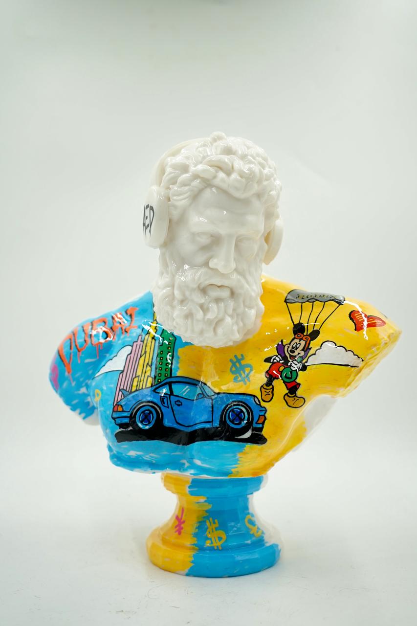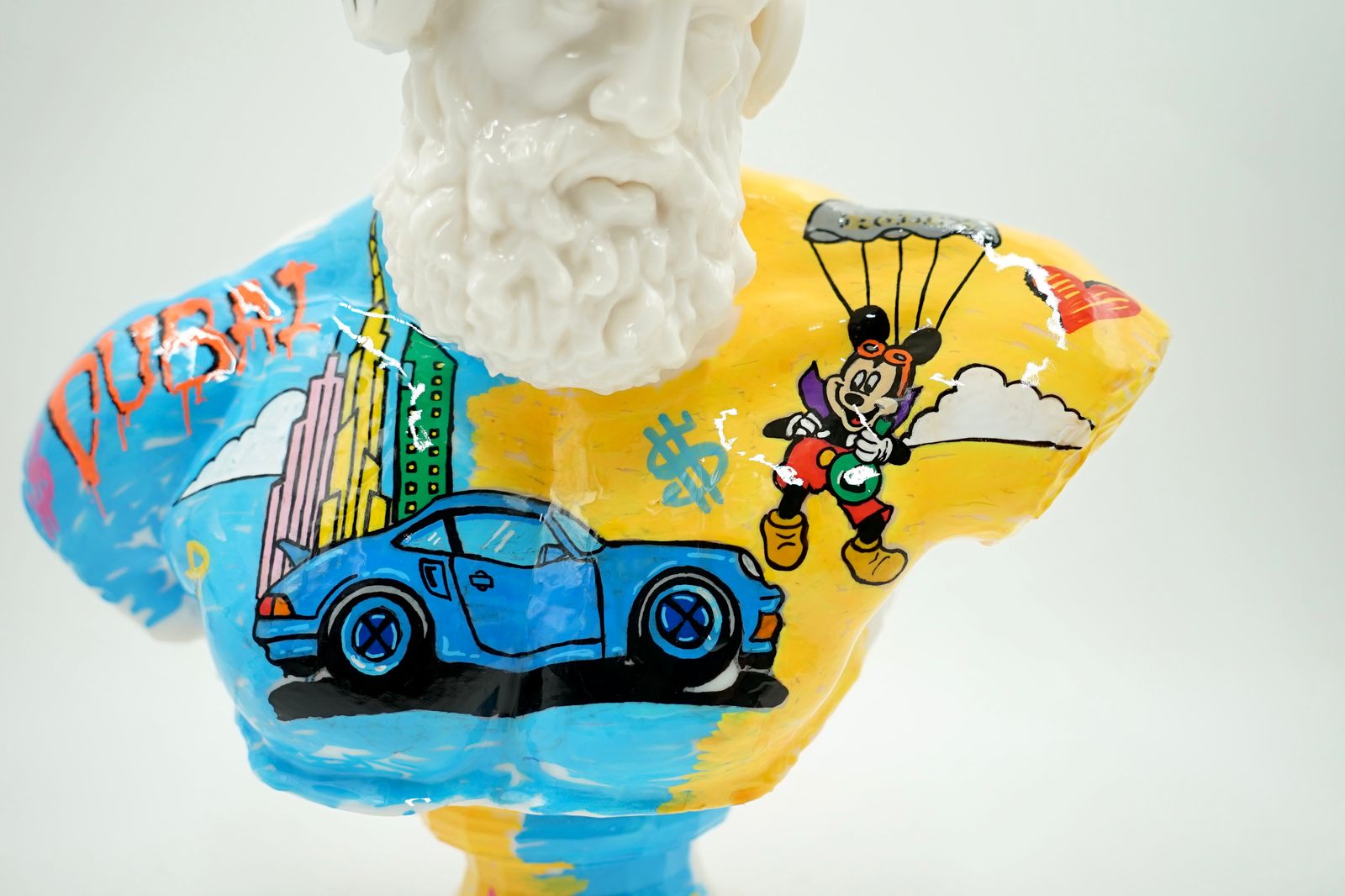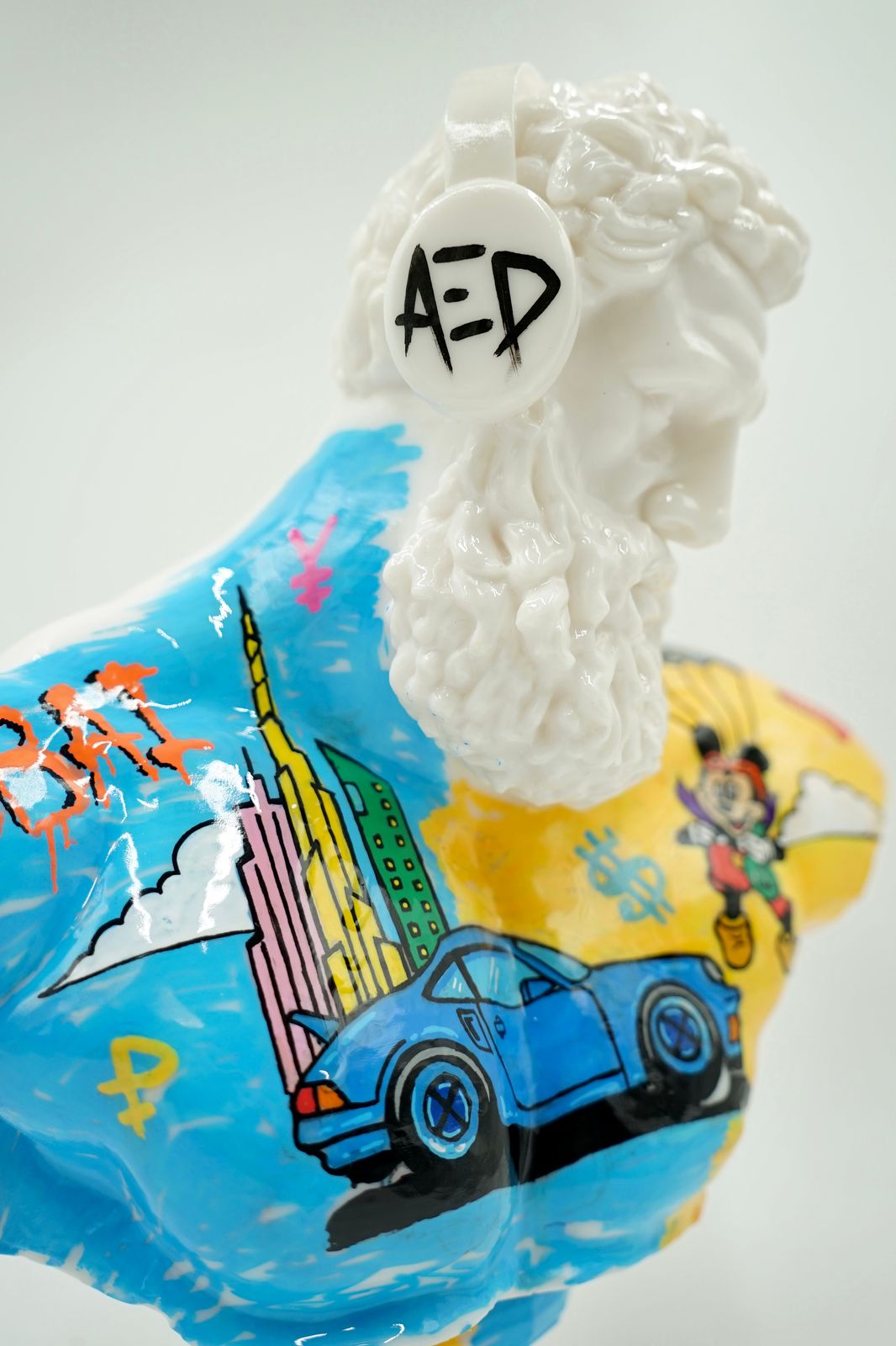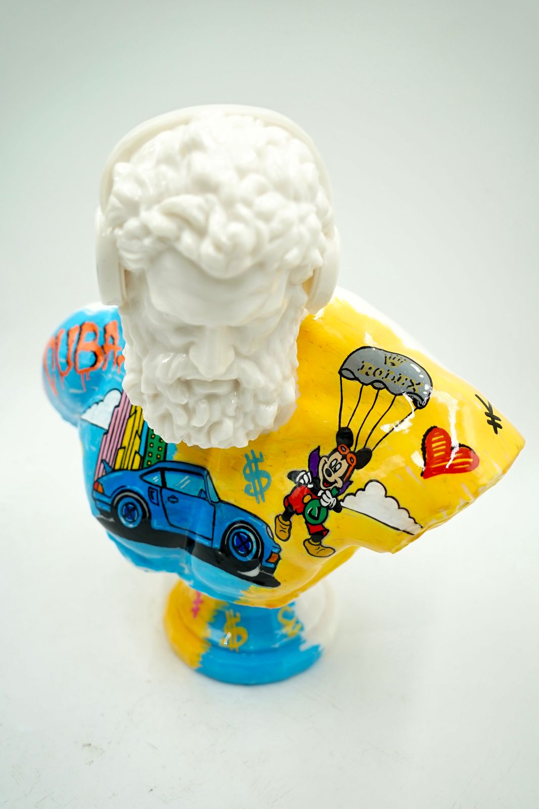Information: Michail, born in Greece in 1992, has developed different techniques over the years. He works mainly with alabaster sculptures, sprays and markers, creating colorful works of art full of contrasts - not only visually, but also in their meaning. Whether painting or sculpture, Michail takes these great examples of Greek beauty norms and adds a twist to our modern culture. With spray paint and markers, he covers ancient deities with symbols, signs and labels that reflect today's cultural "obsessions" - what 21st century culture thinks and dreams about. His mode of expression depicts the transformation of our world and, transforming the statues of ancient Greece into a new art, clearly shows the lack of order in the new world. Michail lives and creates on the island of Mykonos.