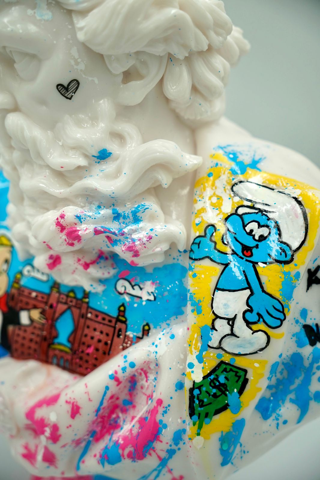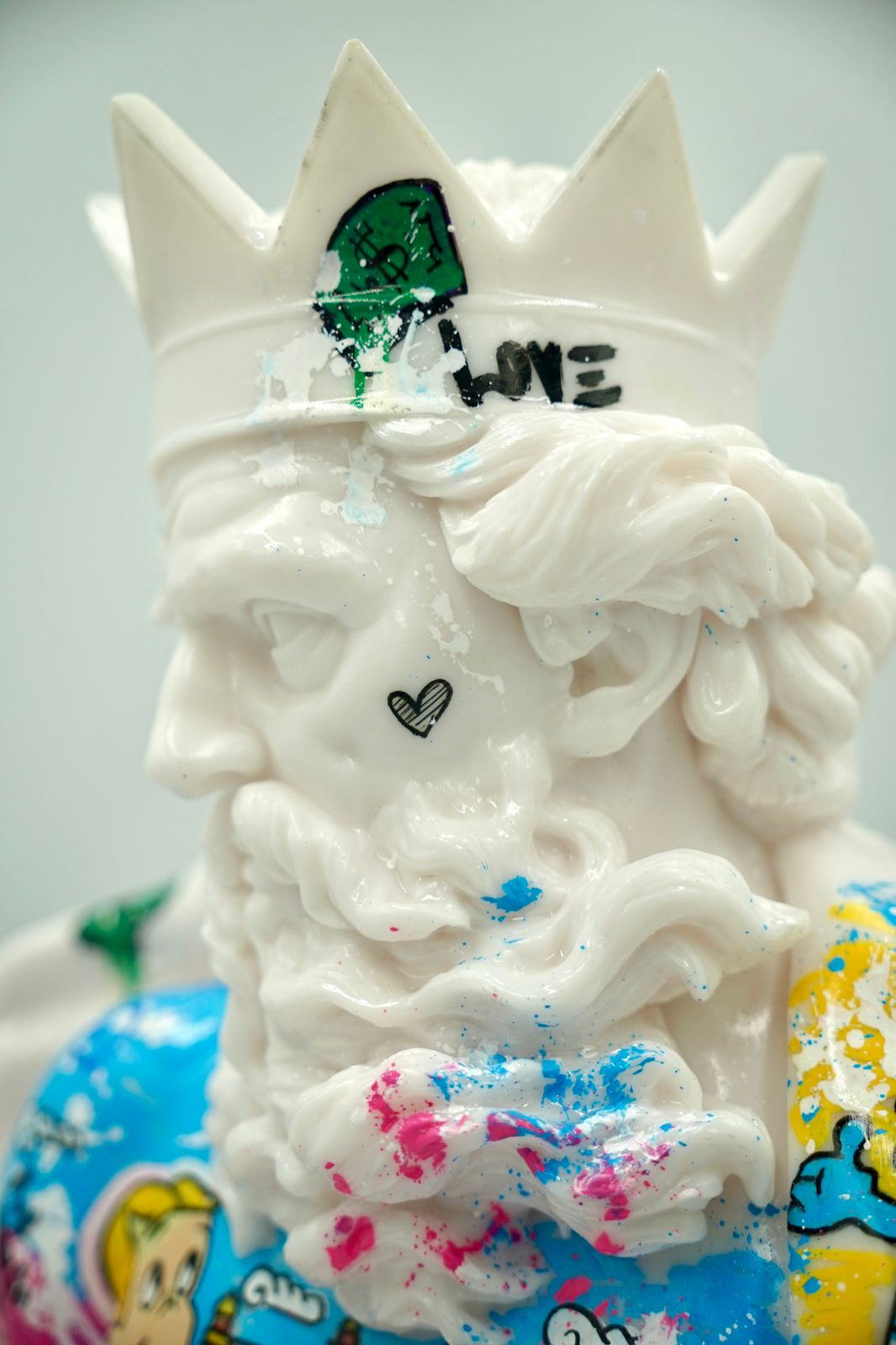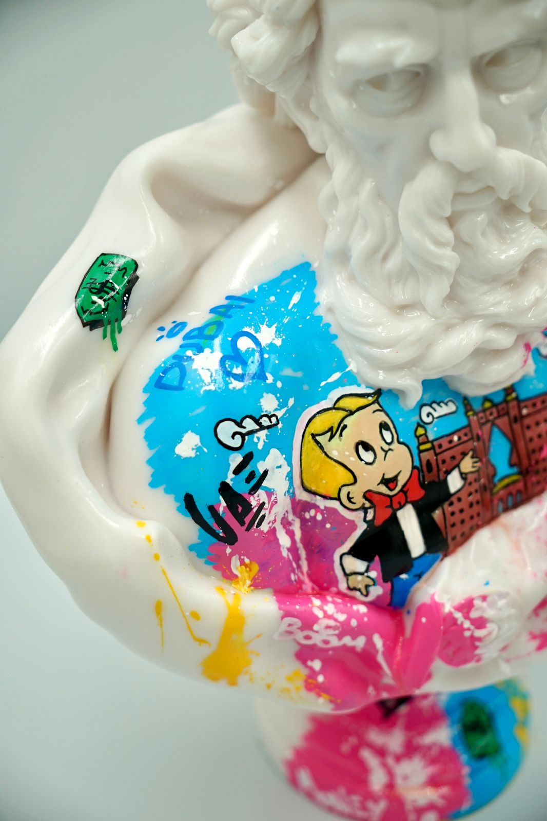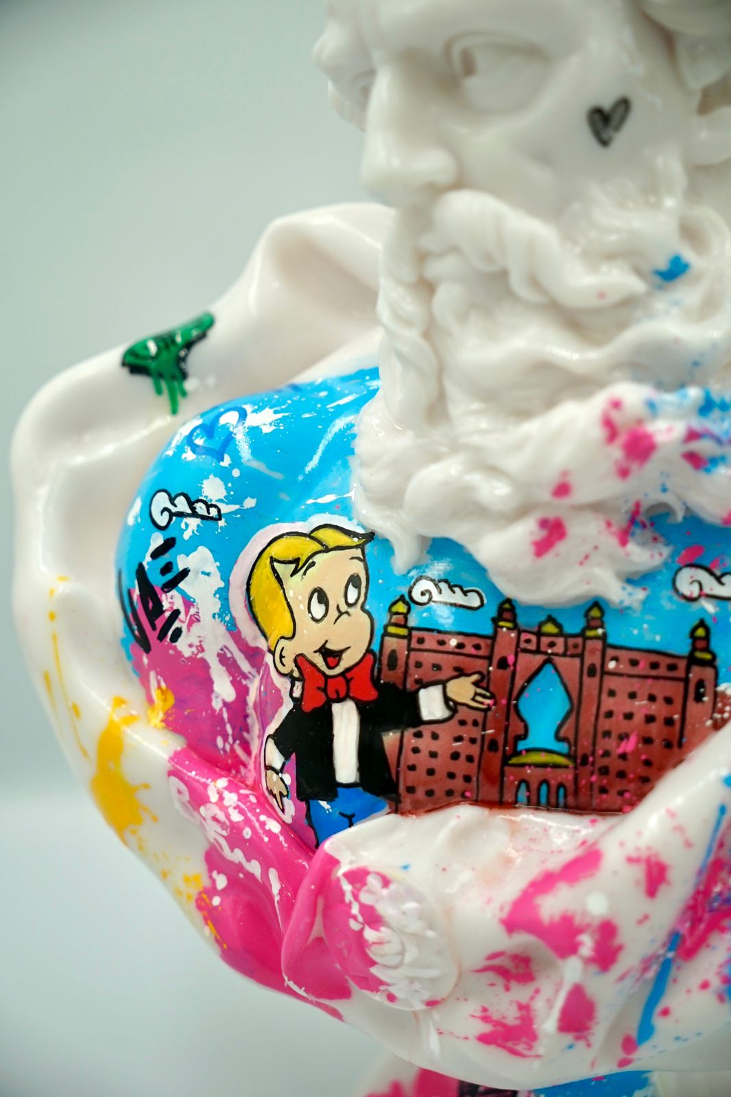 Information: Michail, born in Greece in 1992, has developed different techniques over the years. He works mainly with alabaster sculptures, sprays and markers, creating colorful works of art full of contrasts - not only visually, but also in their meaning. Whether painting or sculpture, Michail takes these great examples of Greek beauty norms and adds a twist to our modern culture. With spray paint and markers, he covers ancient deities with symbols, signs and labels that reflect today's cultural "obsessions" - what 21st century culture thinks and dreams about. His mode of expression depicts the transformation of our world and, transforming the statues of ancient Greece into a new art, clearly shows the lack of order in the new world. Michail lives and creates on the island of Mykonos.