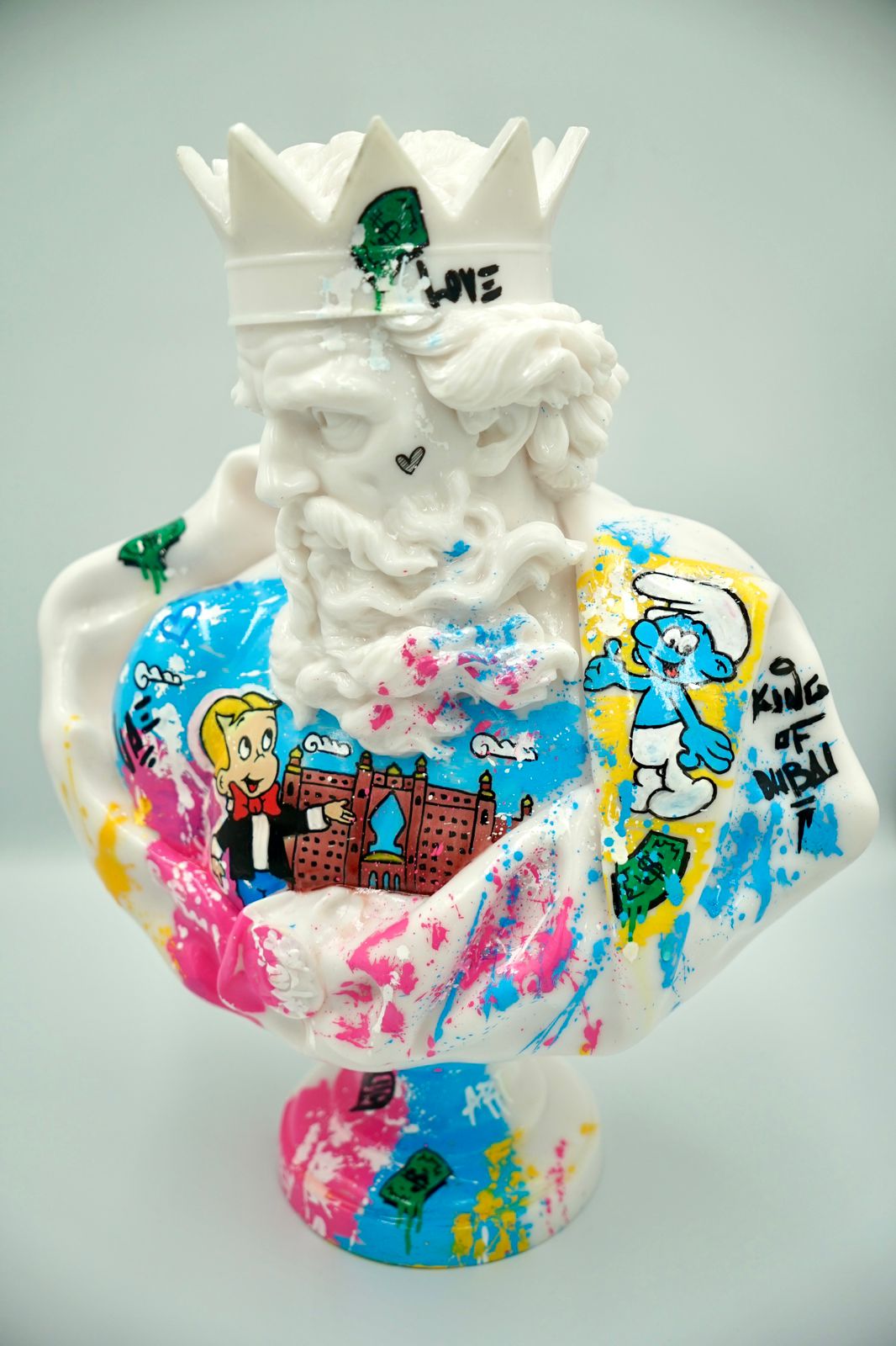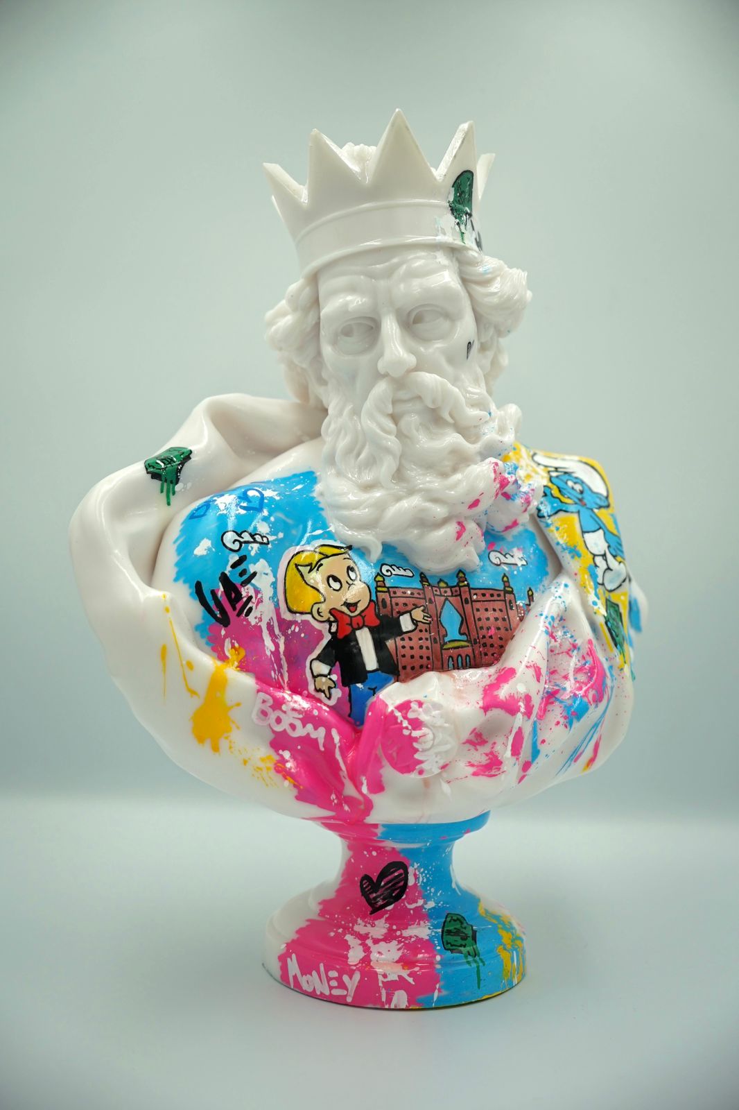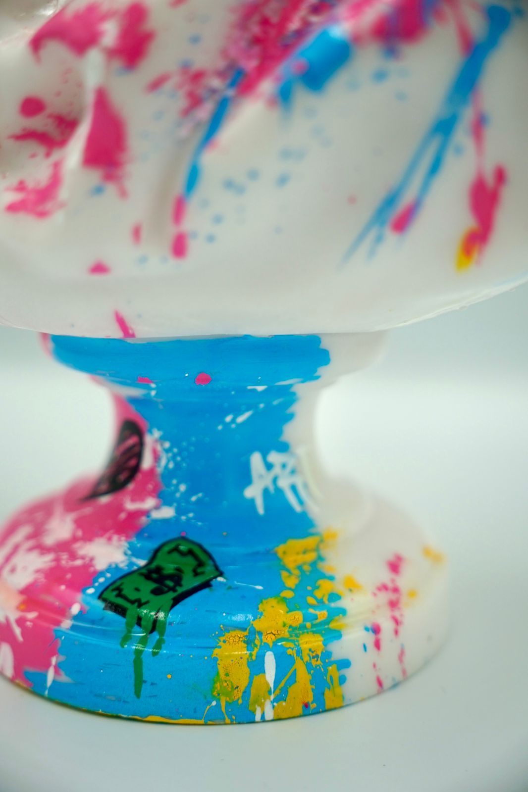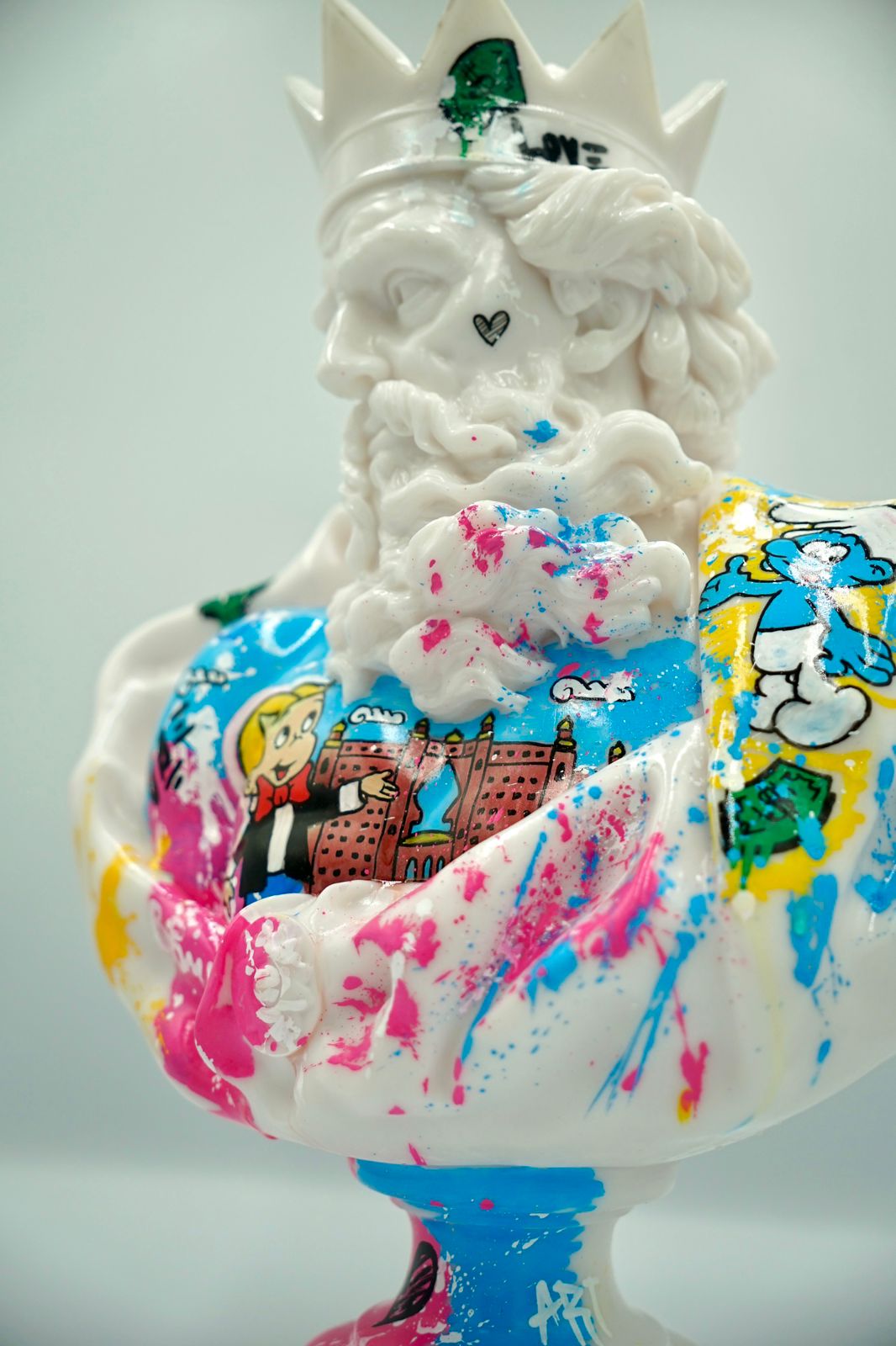 Information: Michail, born in Greece in 1992, has developed different techniques over the years. He works mainly with alabaster sculptures, sprays and markers, creating colorful works of art full of contrasts - not only visually, but also in their meaning. Whether painting or sculpture, Michail takes these great examples of Greek beauty norms and adds a twist to our modern culture. With spray paint and markers, he covers ancient deities with symbols, signs and labels that reflect today's cultural "obsessions" - what 21st century culture thinks and dreams about. His mode of expression depicts the transformation of our world and, transforming the statues of ancient Greece into a new art, clearly shows the lack of order in the new world. Michail lives and creates on the island of Mykonos.