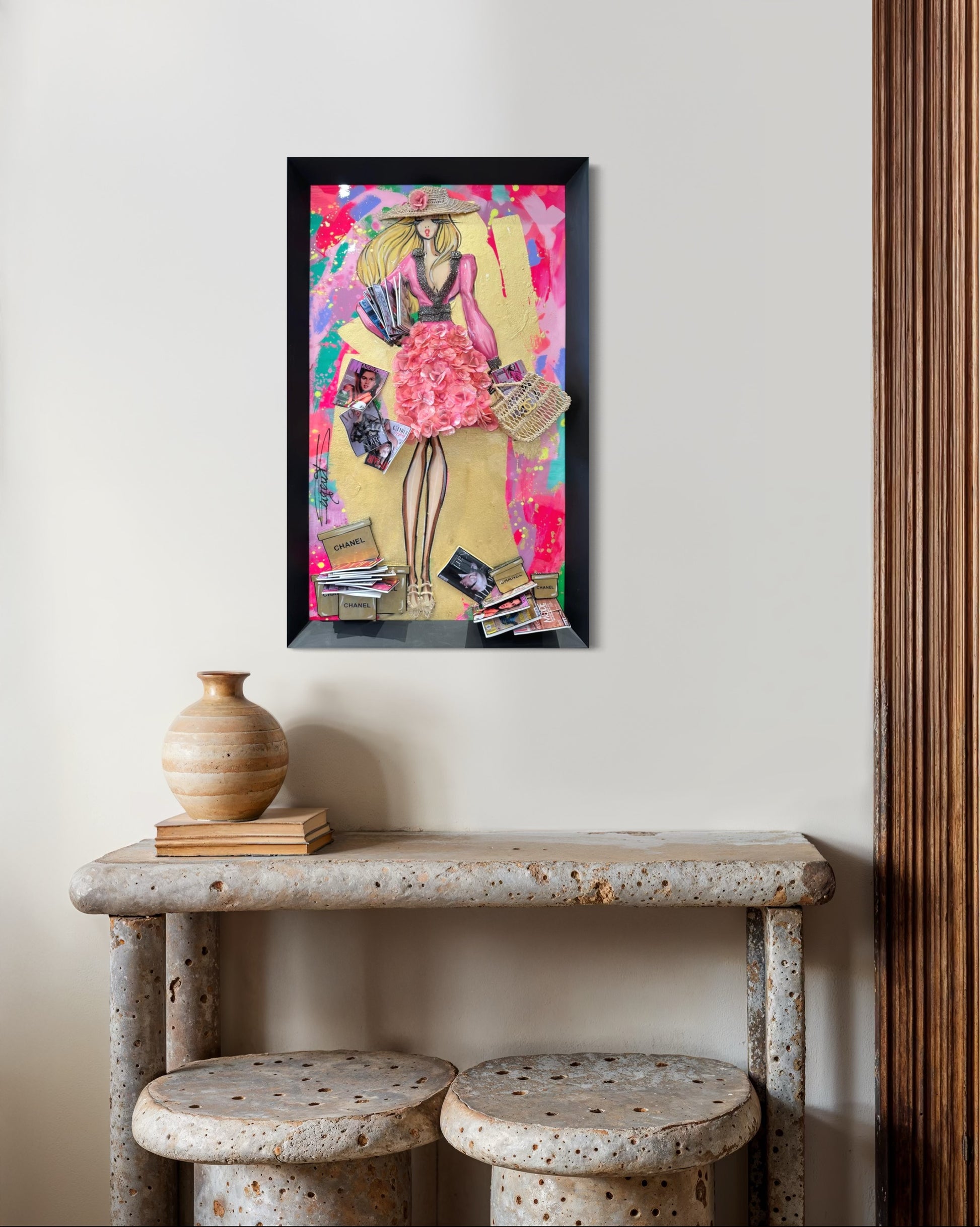 Information : Rachel, stylist by trade, created her heroine more than 10 years ago. We call it ''La Parisienne'': The wavy hair, the dominance of gold by Gustav Klimt, the audacity of Toulouse Lautrec and the modernity of Edmond Kiraz have greatly influenced Rachel since her early childhood. Thanks to her creativity, Rachel thus composes three-dimensional works with a predominance for painting and recycling brand bags, perfume bottles from major brands such as Dior, Chanel, Hermès, Louis Vuitton, Gucci, YSL... of gold, pearls, flowers will come together under his brushstrokes to give unique works. Rachel is a popular French artist that the fashion world adores. Her works are present in the collections of major designers and international collectors.
