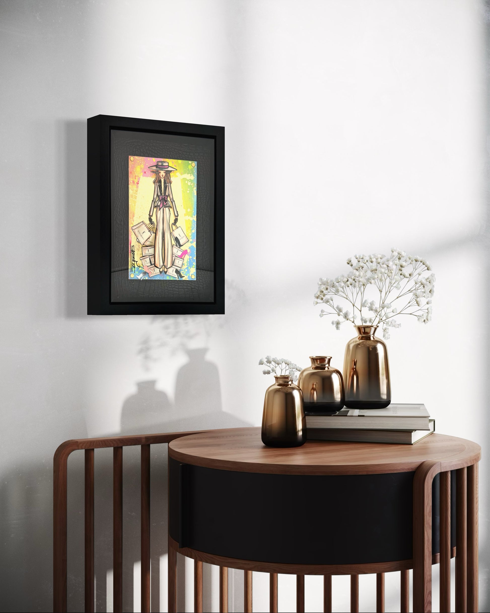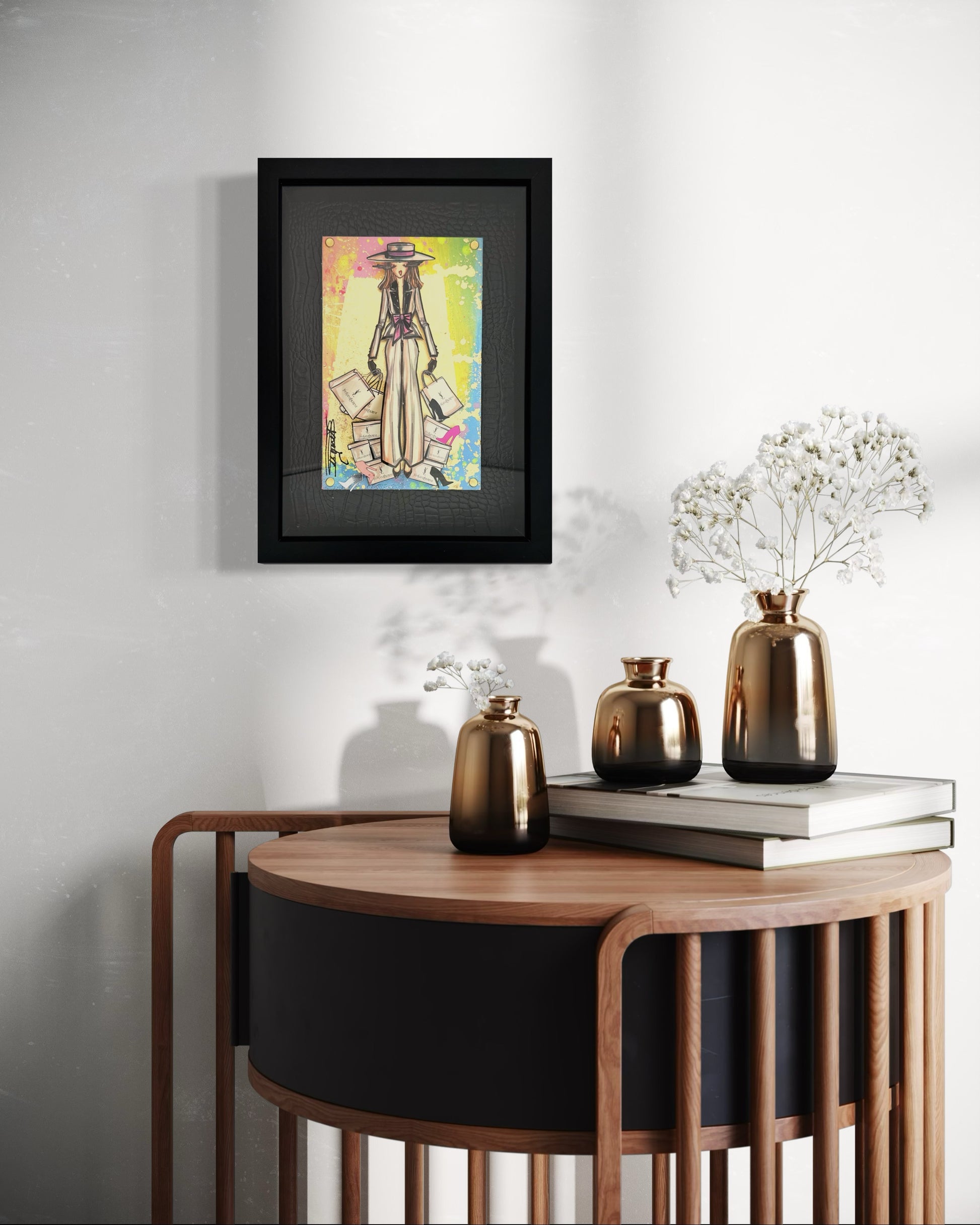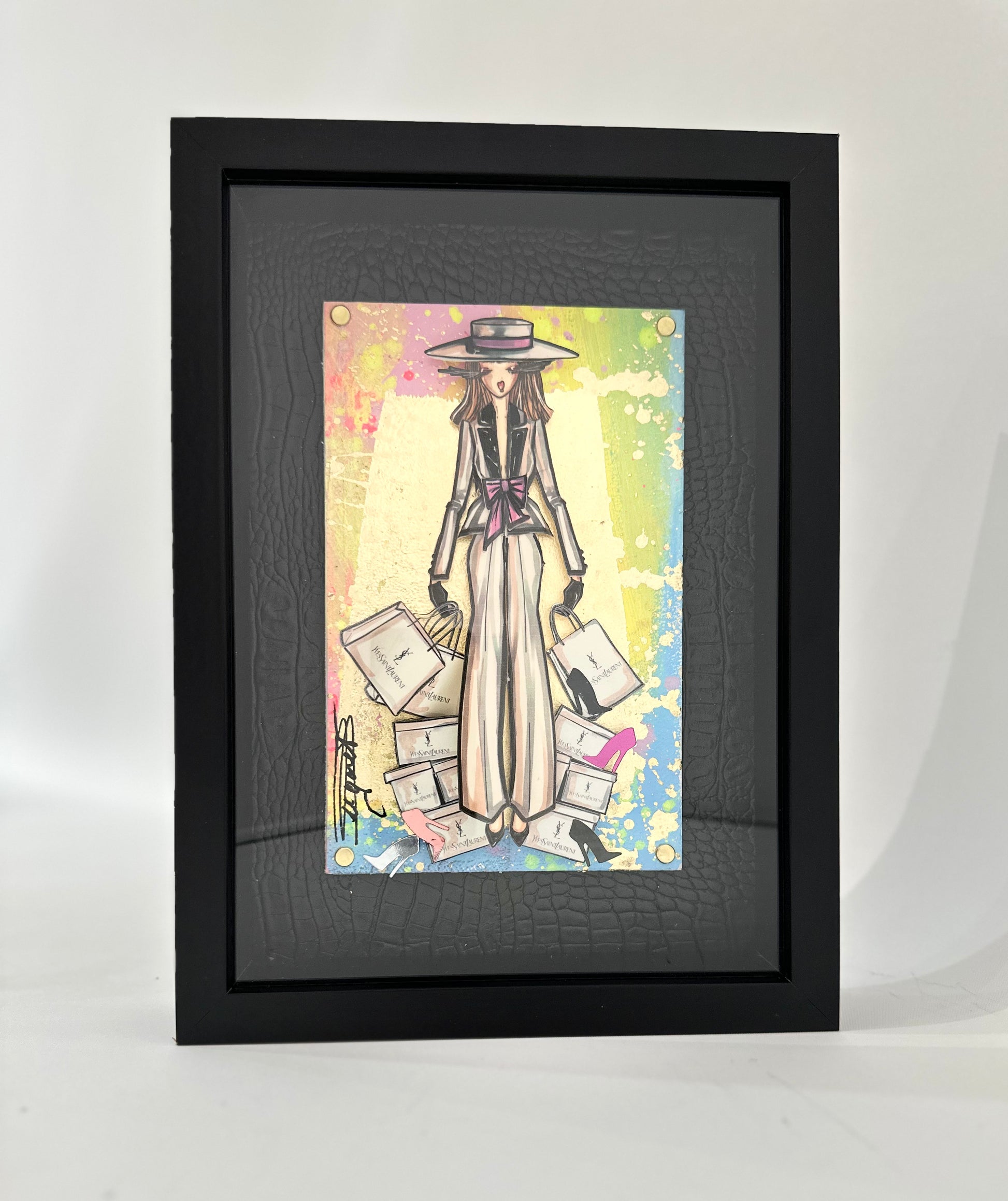 Information : Rachel, stylist by trade, created her heroine more than 10 years ago. We call it ''La Parisienne'': The wavy hair, the dominance of gold by Gustav Klimt, the audacity of Toulouse Lautrec and the modernity of Edmond Kiraz have greatly influenced Rachel since her early childhood. Thanks to her creativity, Rachel thus composes three-dimensional works with a predominance for painting and recycling brand bags, perfume bottles from major brands such as Dior, Chanel, Hermès, Louis Vuitton, Gucci, YSL... of gold, pearls, flowers will come together under his brushstrokes to give unique works. Rachel is a popular French artist that the fashion world adores. Her works are present in the collections of major designers and international collectors.