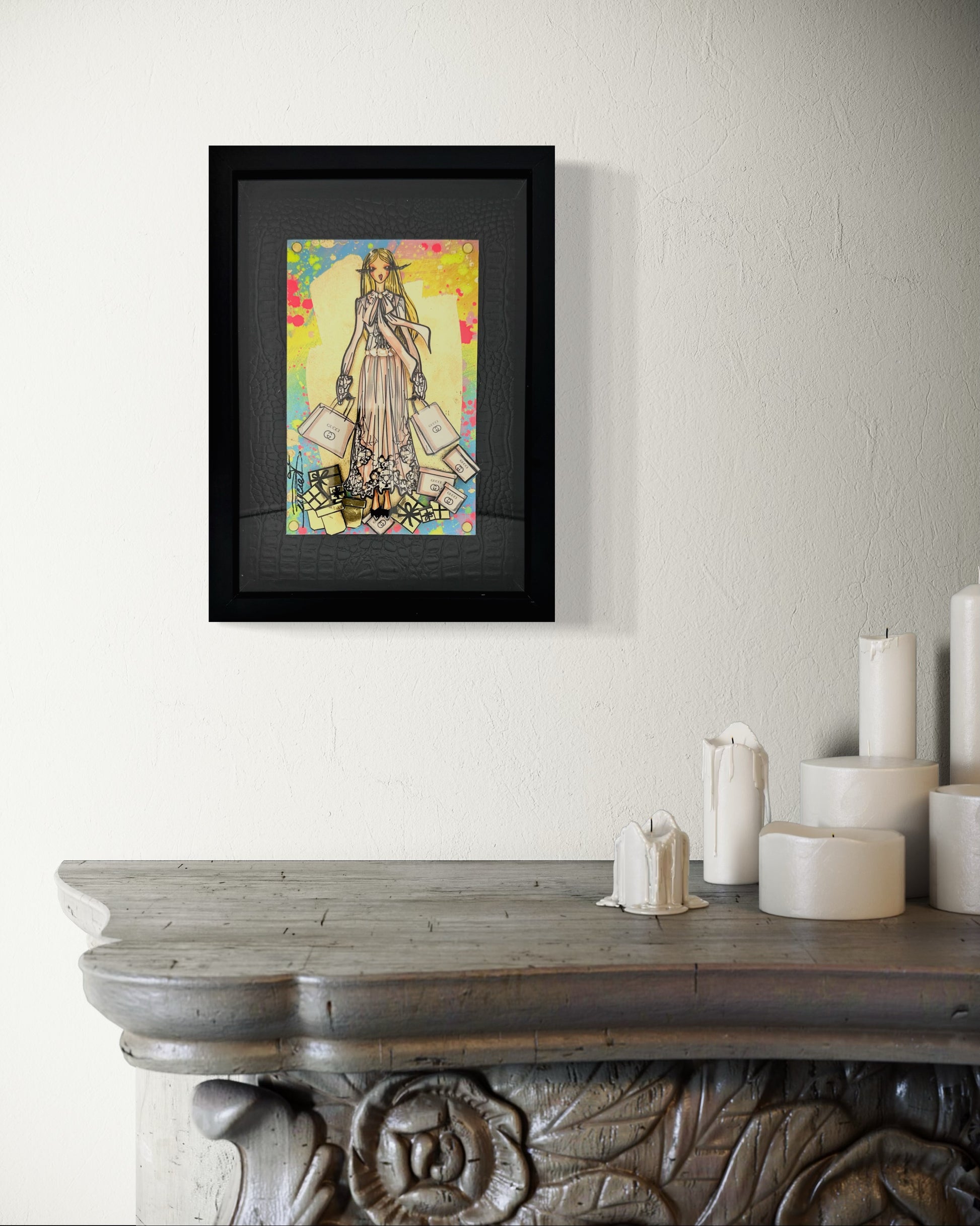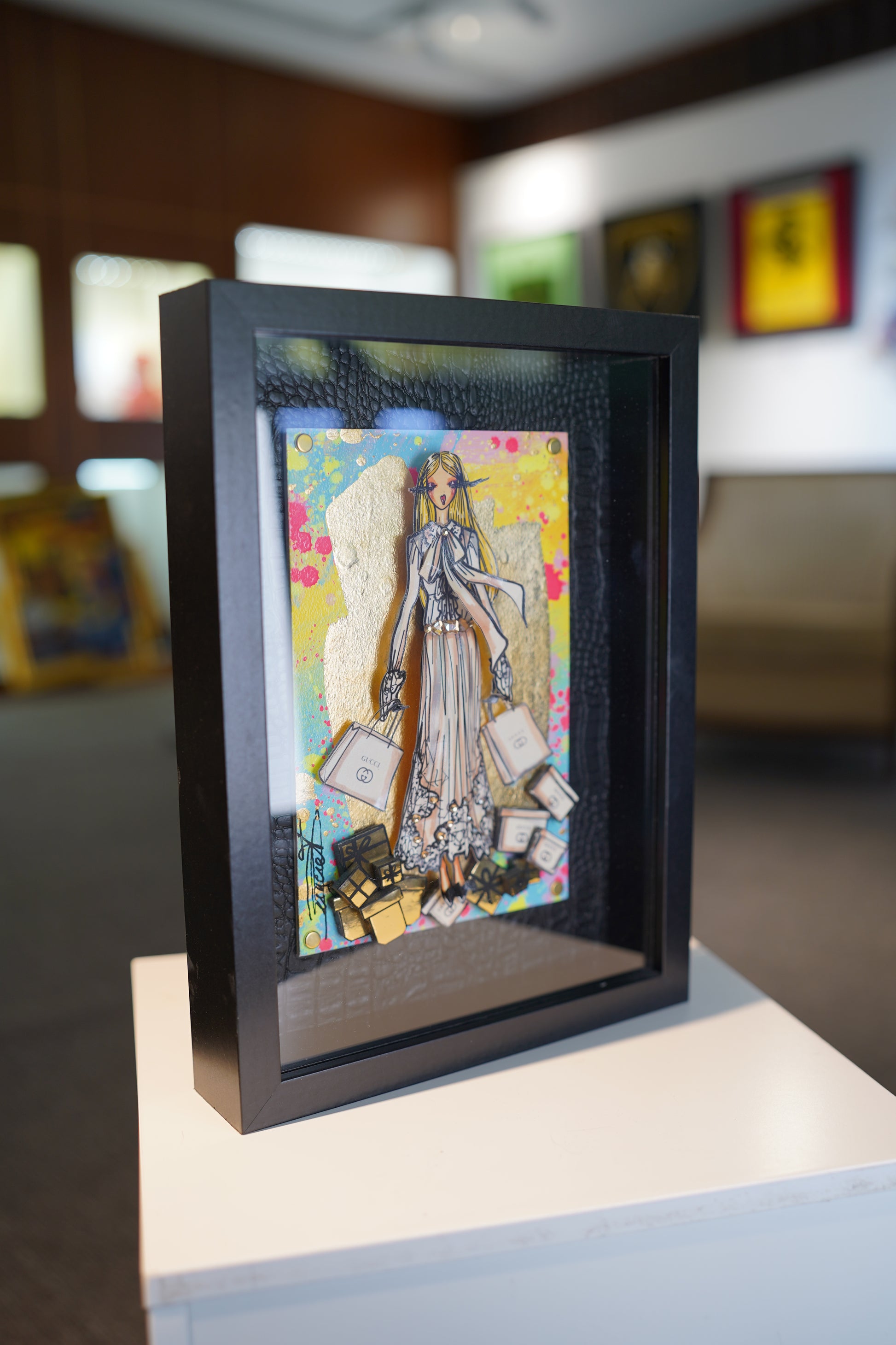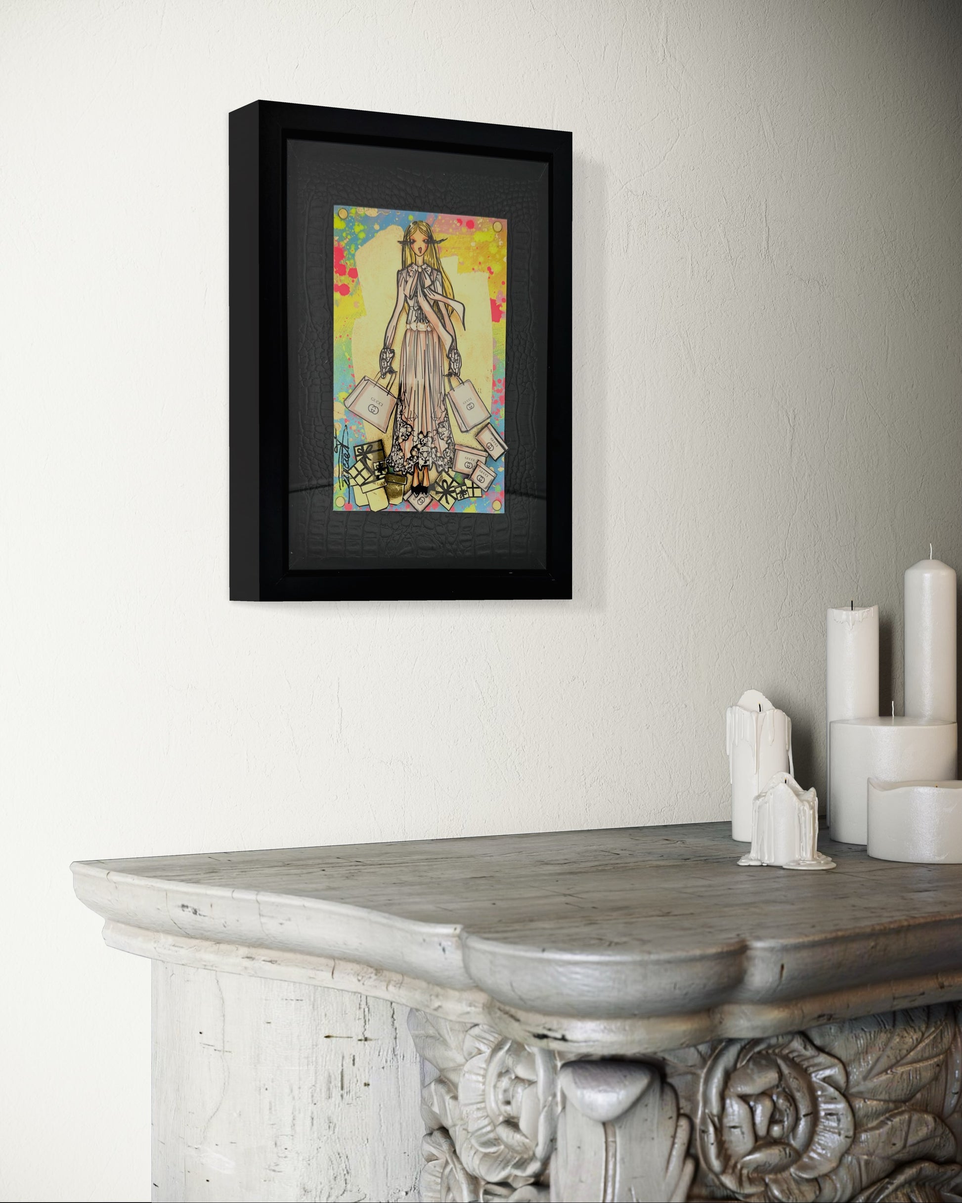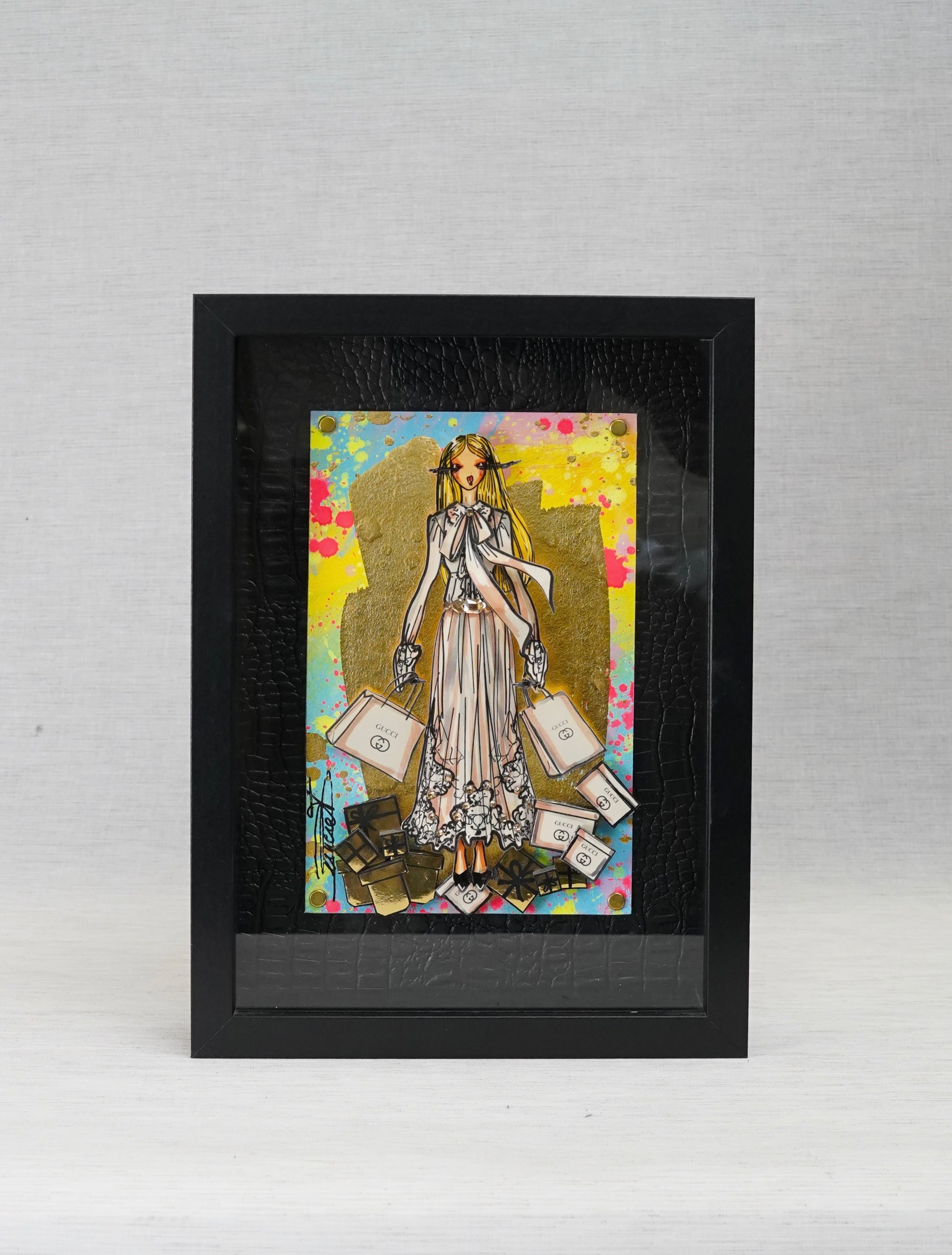 Information : Rachel, stylist by trade, created her heroine more than 10 years ago. We call it ''La Parisienne'': The wavy hair, the dominance of gold by Gustav Klimt, the audacity of Toulouse Lautrec and the modernity of Edmond Kiraz have greatly influenced Rachel since her early childhood. Thanks to her creativity, Rachel thus composes three-dimensional works with a predominance for painting and recycling brand bags, perfume bottles from major brands such as Dior, Chanel, Hermès, Louis Vuitton, Gucci, YSL... of gold, pearls, flowers will come together under his brushstrokes to give unique works. Rachel is a popular French artist that the fashion world adores. Her works are present in the collections of major designers and international collectors.