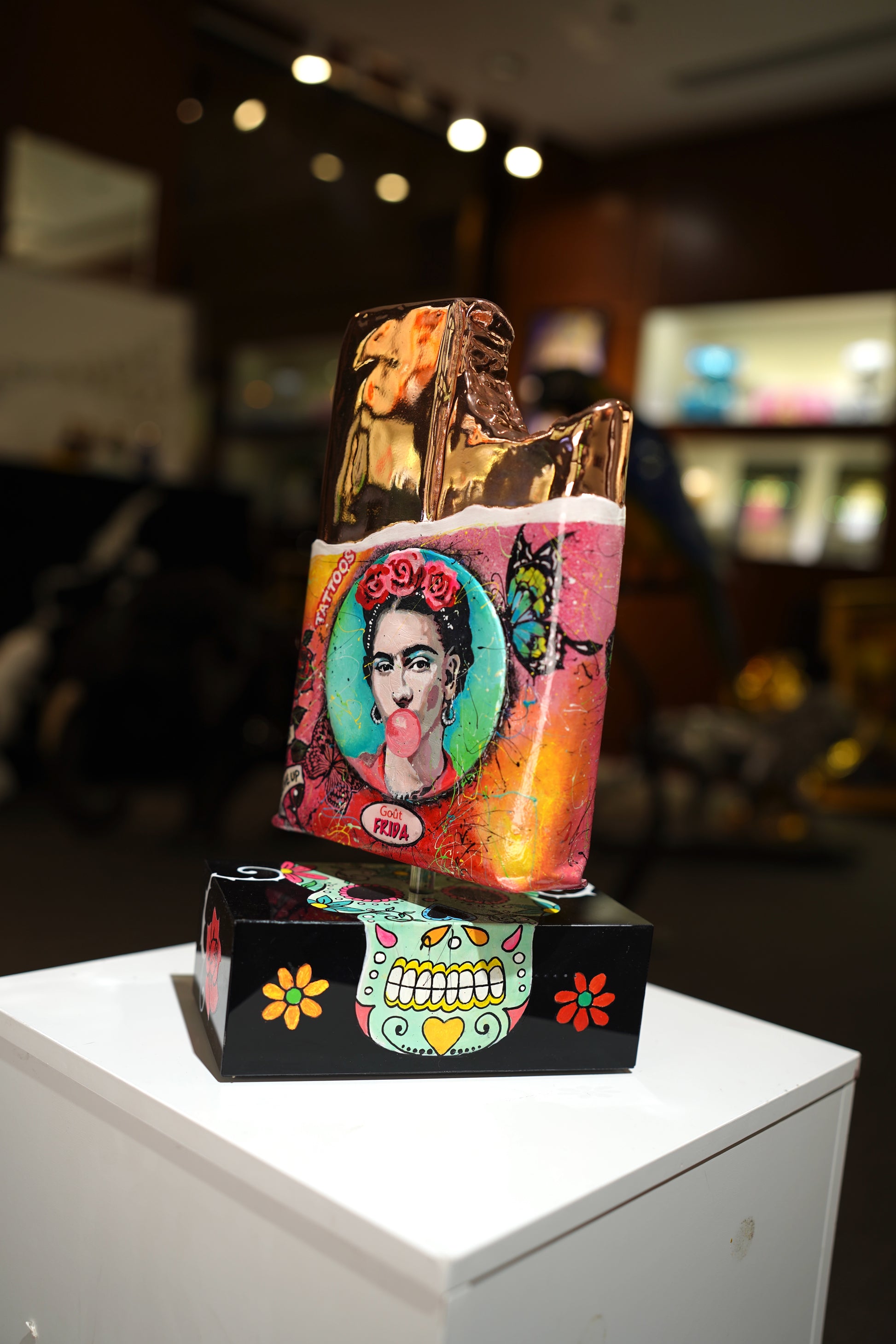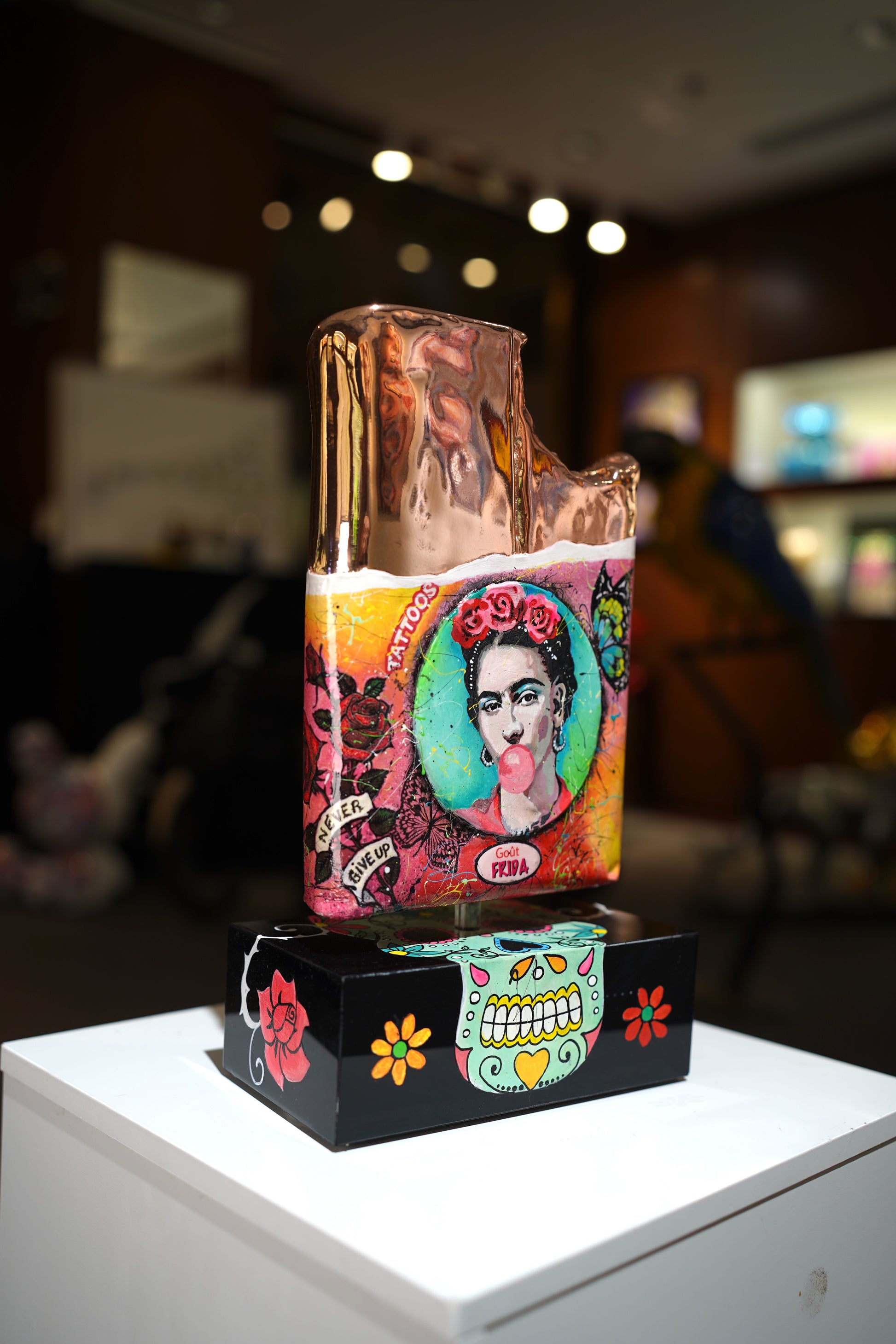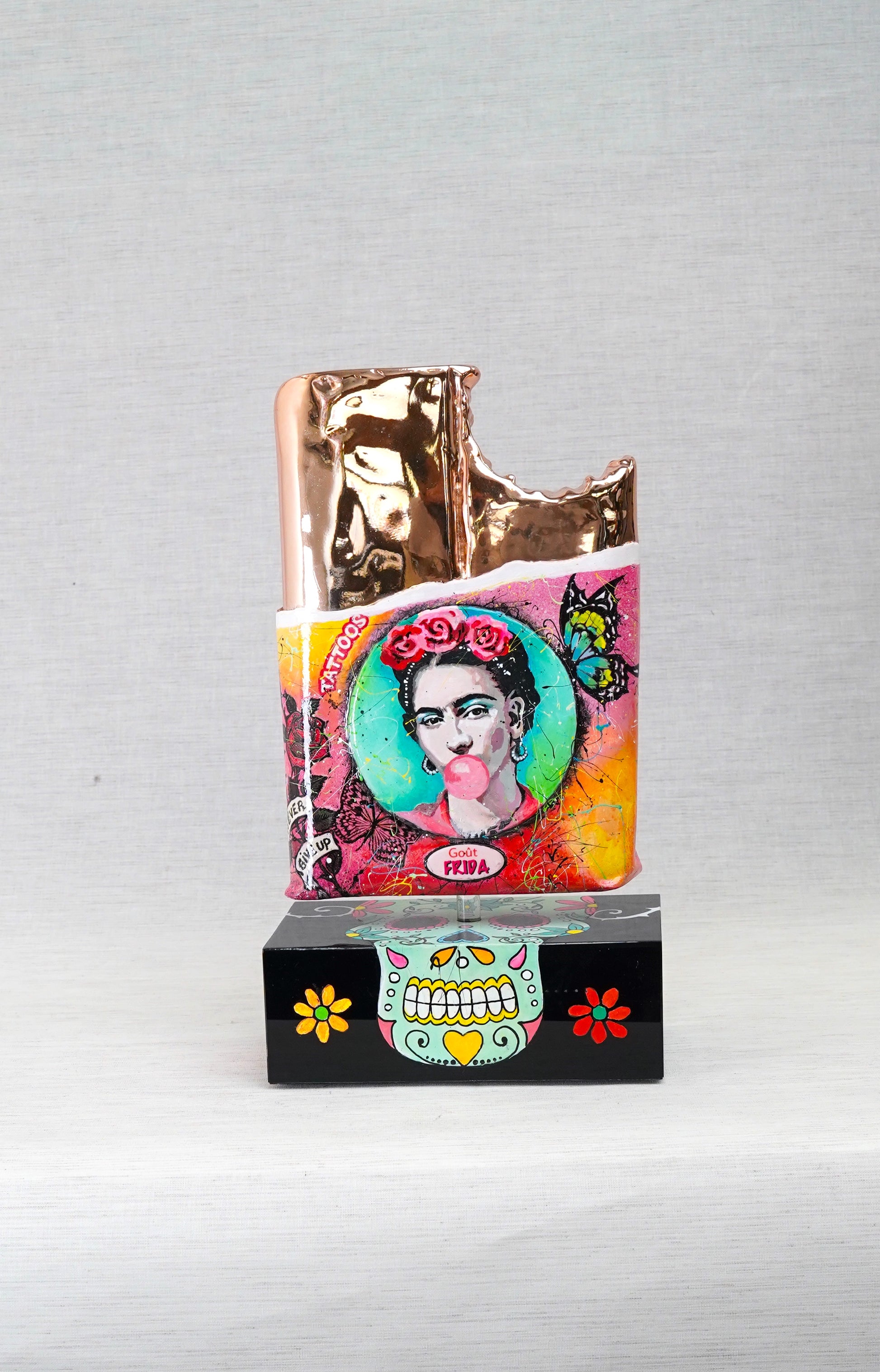 In painting and drawing since always, Rakel has carved out a place of choice in Contemporary Art, and more particularly in Pop Art in barely 10 years. Better still, she has become a must and juggles between her painter and visual artist hat brilliantly. Known and recognized for her strong and singular identity endowed with an unprecedented dose of optimism and cheerfulness, she created her own movement: Rebel’Art. Between canvases enthroning the icons that fascinate her like Andy Warhol, Basquiat, Marylin or even Kate Moss and Gainsbourg.Indeed, coming to life in 3D, the sculptures made by hand in unique pieces take up the design of the famous chewing gum dear to the permissive years.