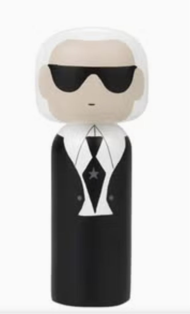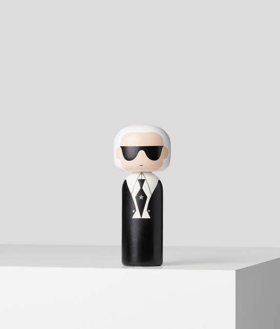 Information about the sculpture: This kokeshi inspired by Karl is a stylish and sophisticated wooden doll that pays homage to the iconic fashion designer and creative director.It features a sleek and chic design with his signature high-collared shirt, black tie, and sunglasses, all inspired by his unmistakable fashion sense. The kokeshi is a playful representation of Karl’s iconic style and creativity, capturing the essence of his innovative and visionary approach to fashion.