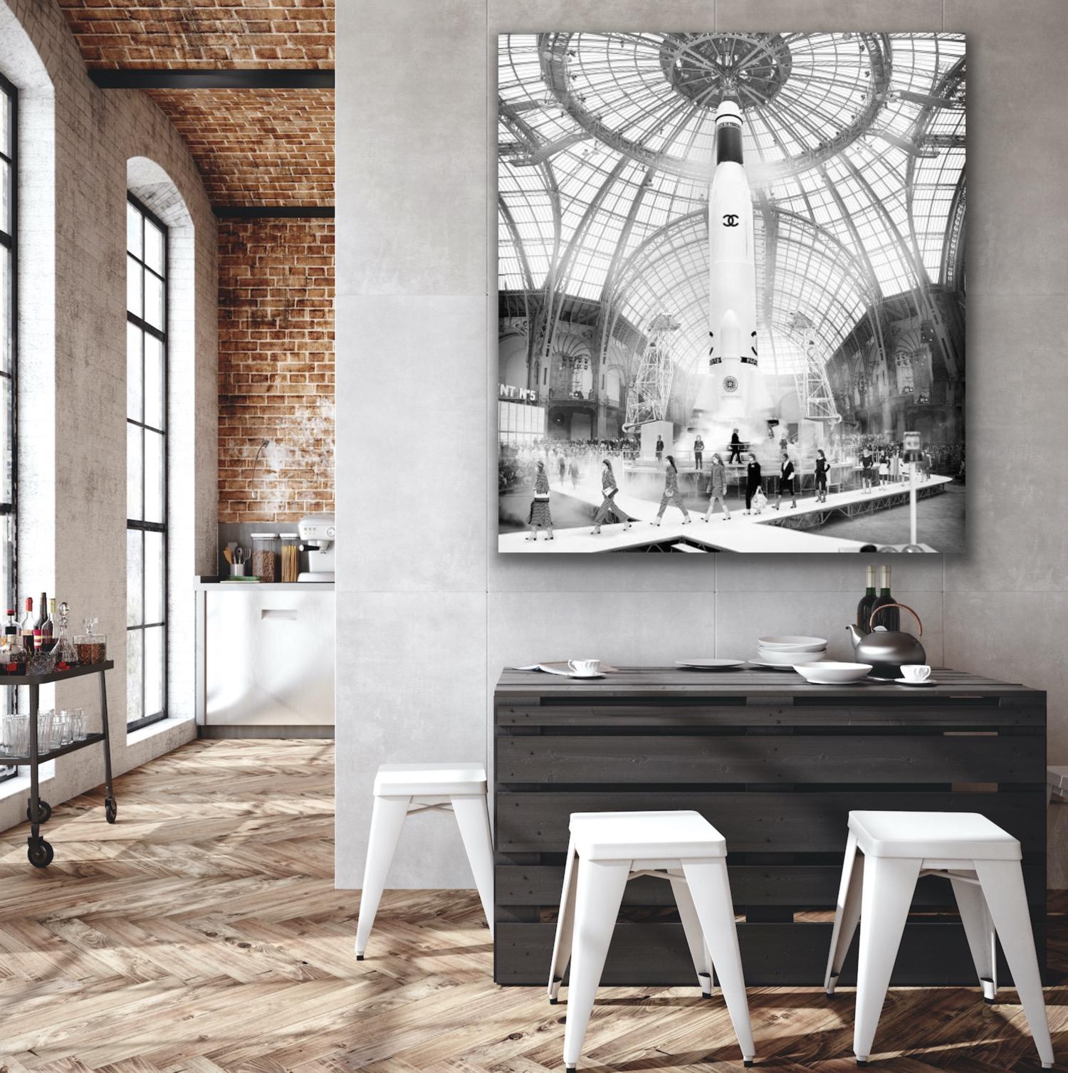 Information about the artwork: Chanel launched a line of space-themed fashion and a custom Chanel rocket at Paris Fashion Week F/W 2017 in Paris. For the finale, the Chanel rocket actually blasted off smoke included following a dramatic 10-second countdown. Models lined up and Elton John's "Rocket Man" played. In this version, Simon has incorporated actual footage from the real NASA Rocket launches.
