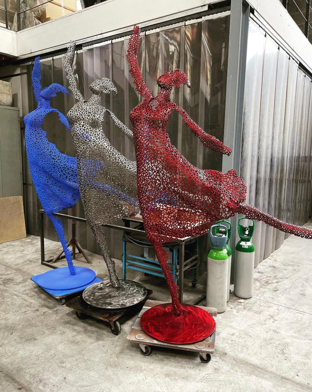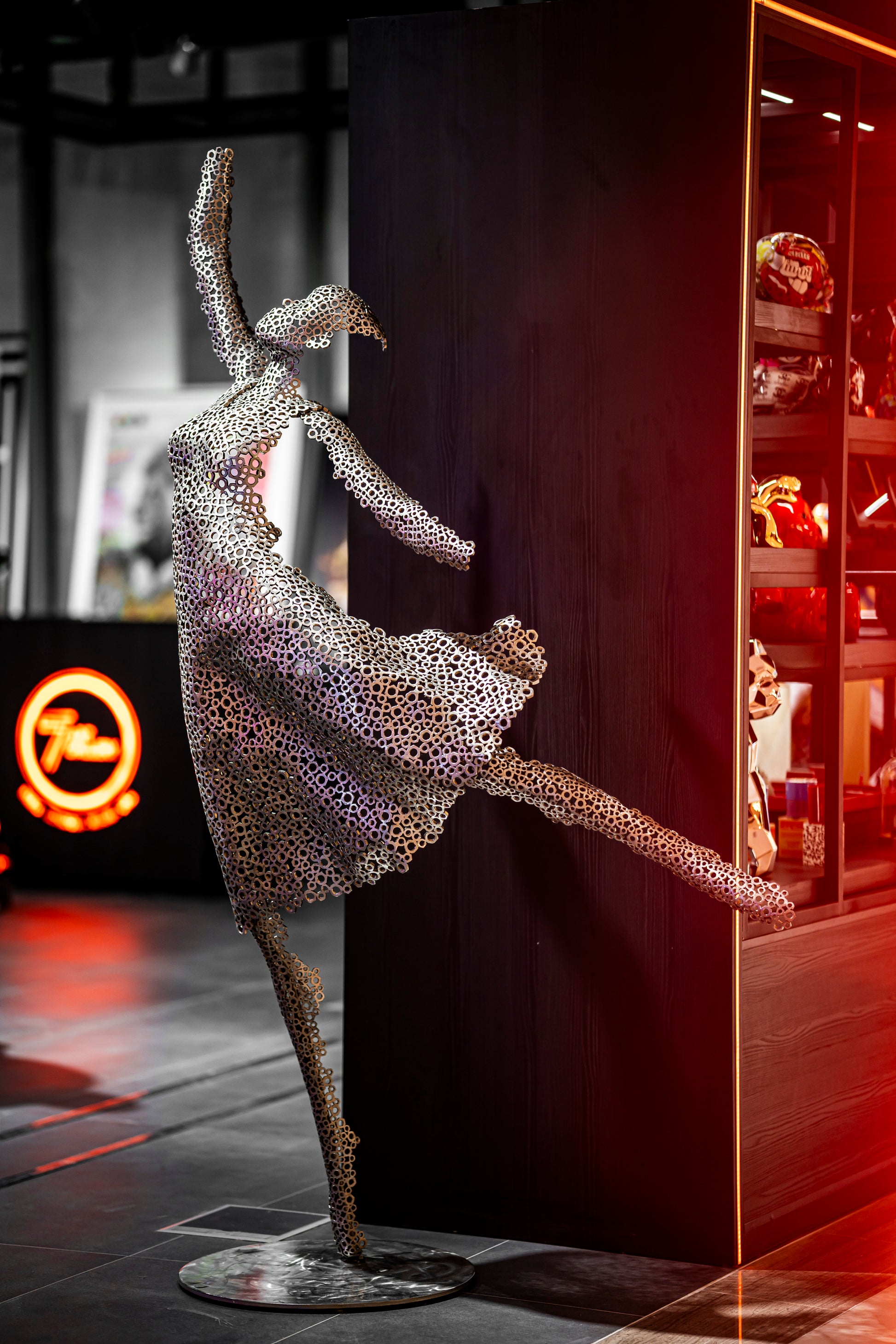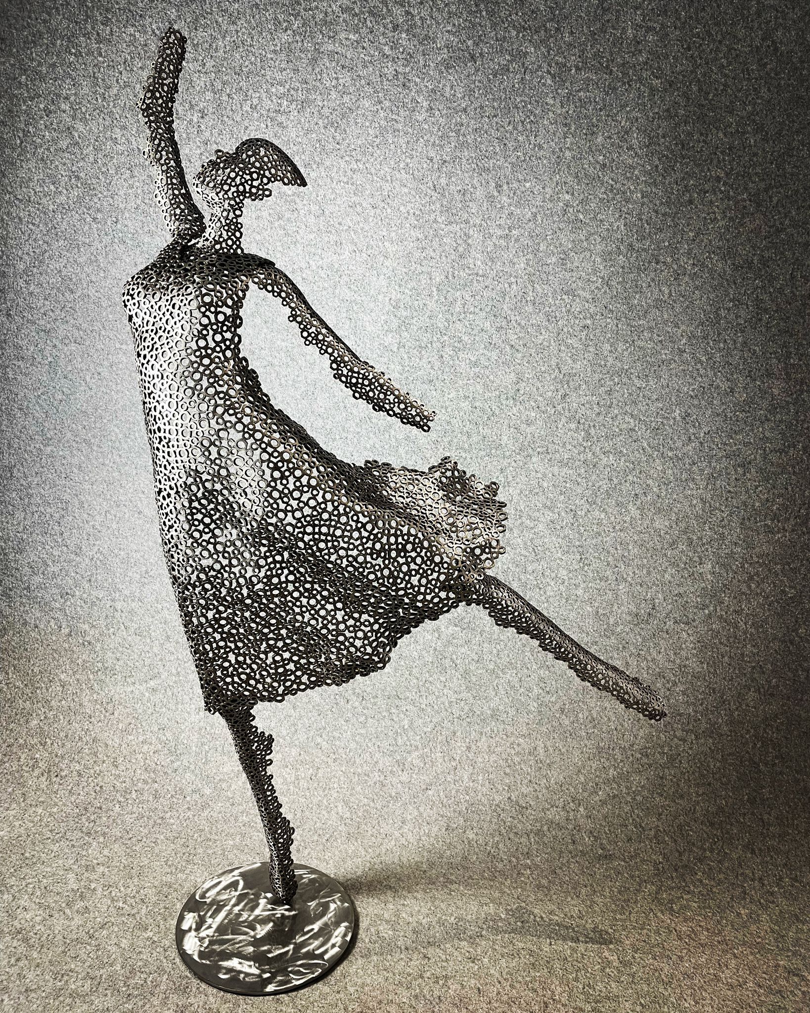 Information: VYKI creates figurative and contemporary sculptures linking steel to the human body. His works aim to provoke reaction, reflection and adhesion at first glance. Following his visit to several design schools and naturally attracted by the work of volume, materials and their formatting, he focused on steel in particular. Having learnt the handling and characteristics of steel conventionally during his studies, he decided to continue this development in a less limited artistic setting ; allowing to deviate from certain rules that correspond to the industry. Thanks to an overflowing and spontaneous imagination, he creates light and complex works, aesthetic and unique! Steel, cold and industrial materials by definition gives an impression of lightness thanks to the use of welded stainless bolts between them. This compositional technique gives a lace effect, we find the hard and solid side of the metal associated with the suppleness and softness of a fabric. The works of VYKI are discovered in two time, the first being the observation of the sculpture and its general forms and the second being the discovery of the composition and the meticulous work done on each piece. At the crossroads between contemporary art and the human body, VYKI creates works that resemble us and that fit into the air of time.