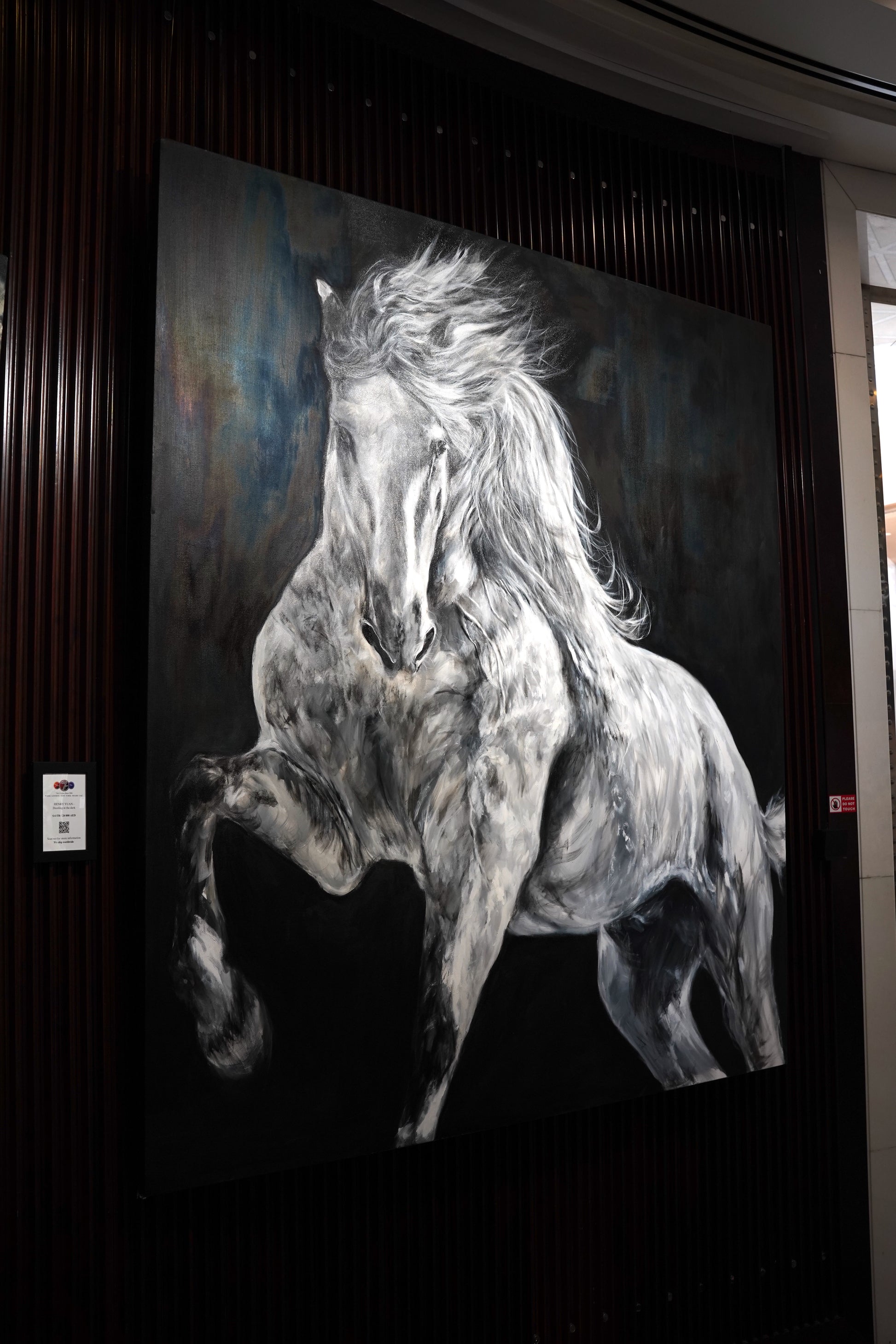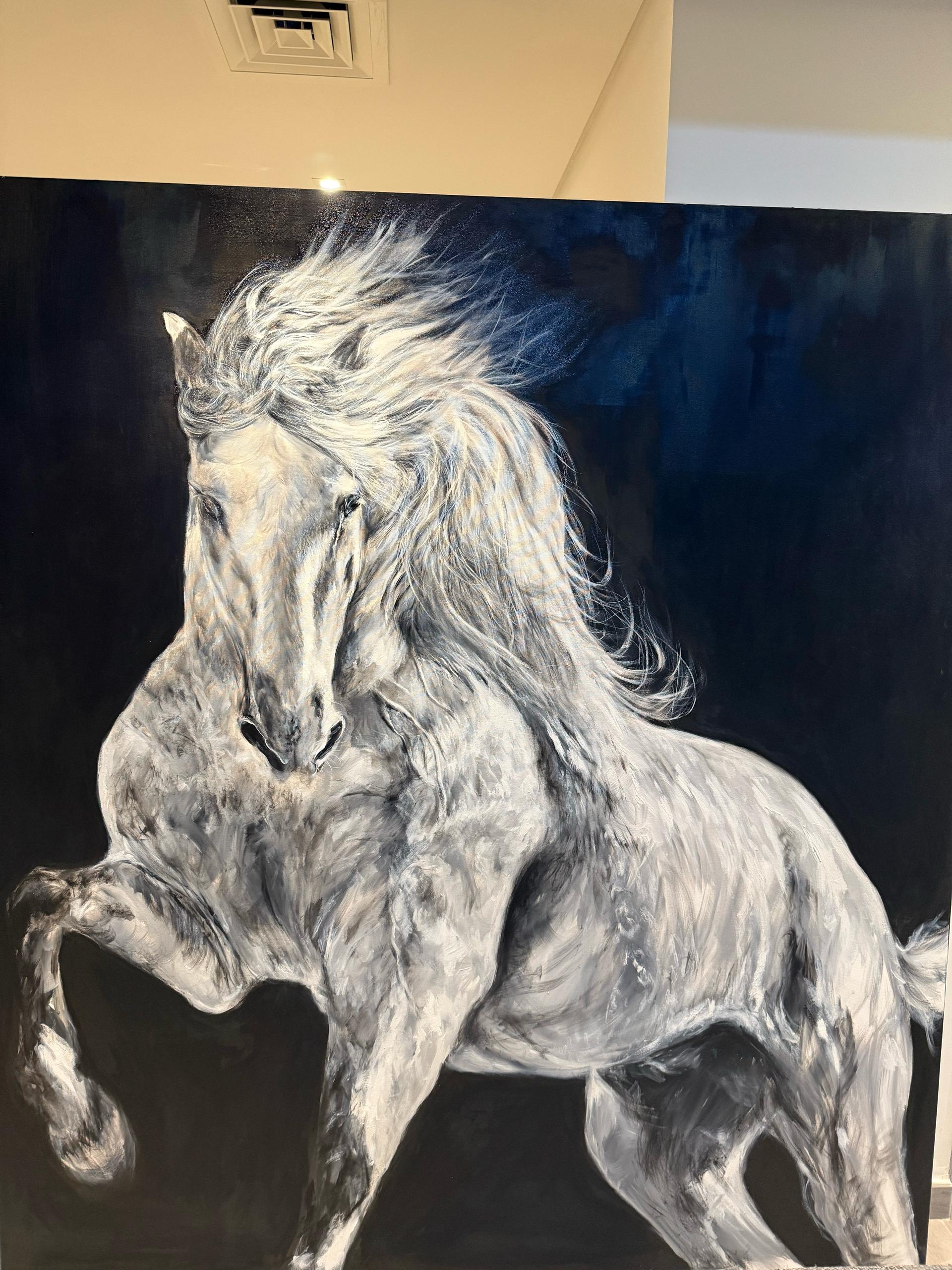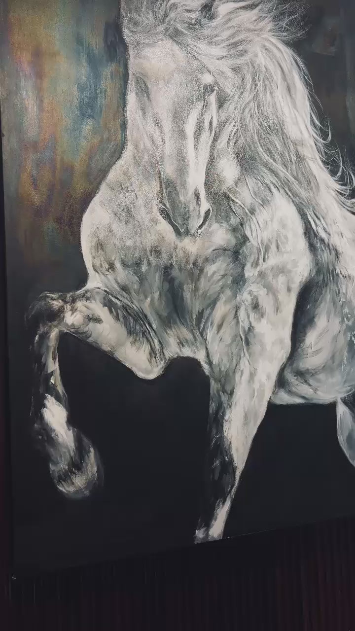 Information: This is a horse breaking through the night, racing toward the dawn, symbolizing courage, determination, and fearlessness in the face of adversity; it is a striking white.