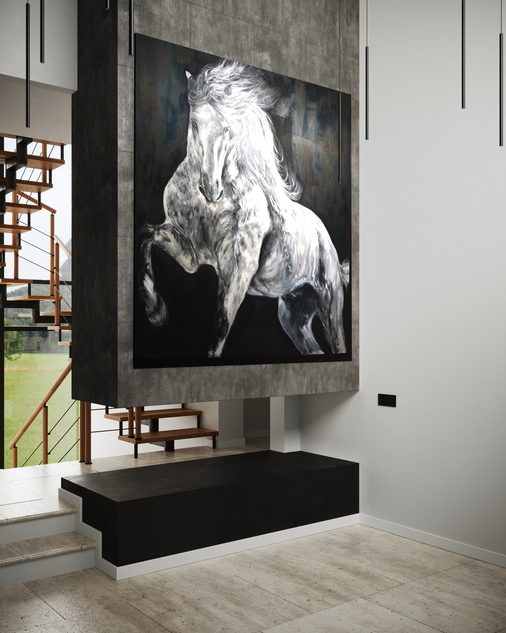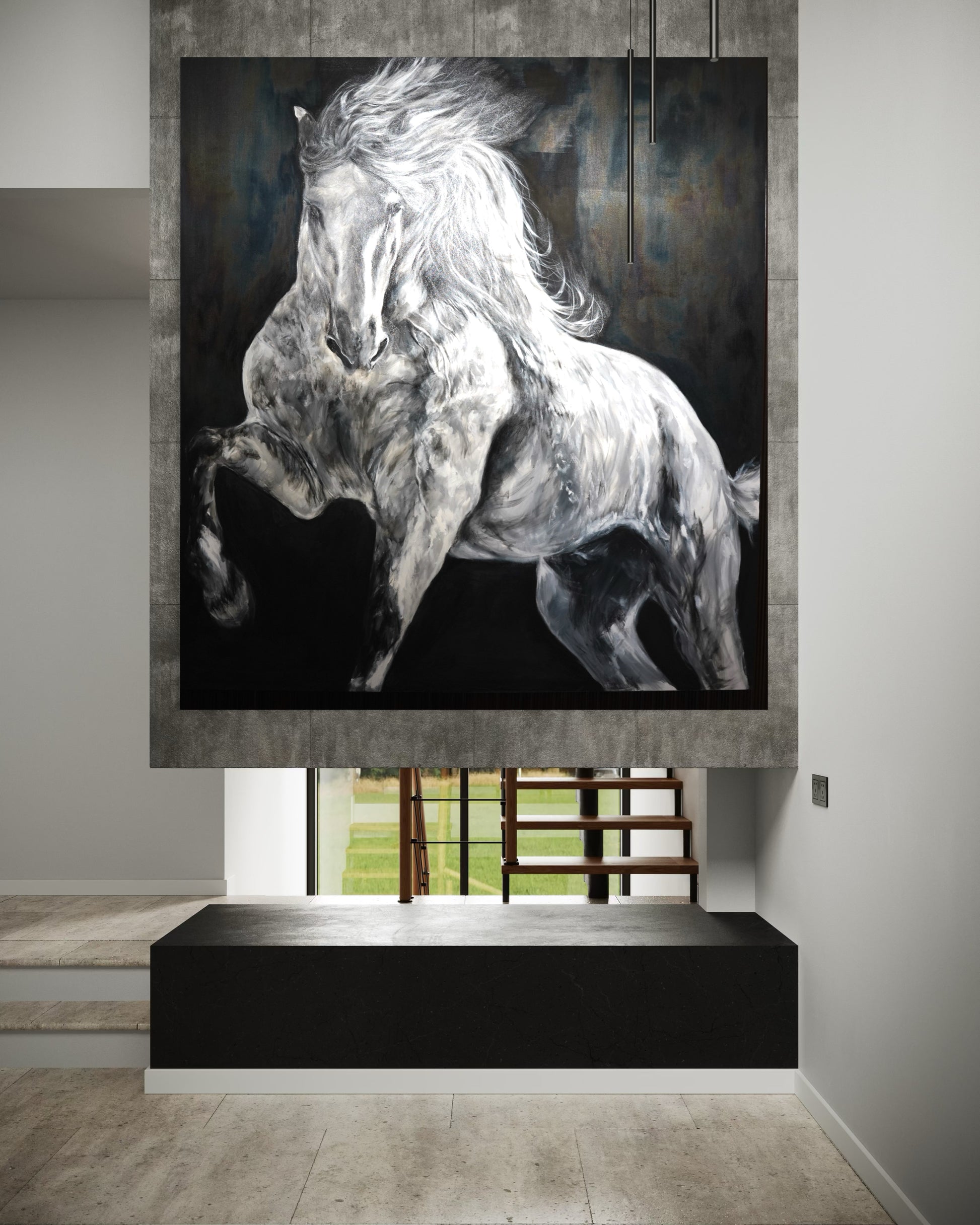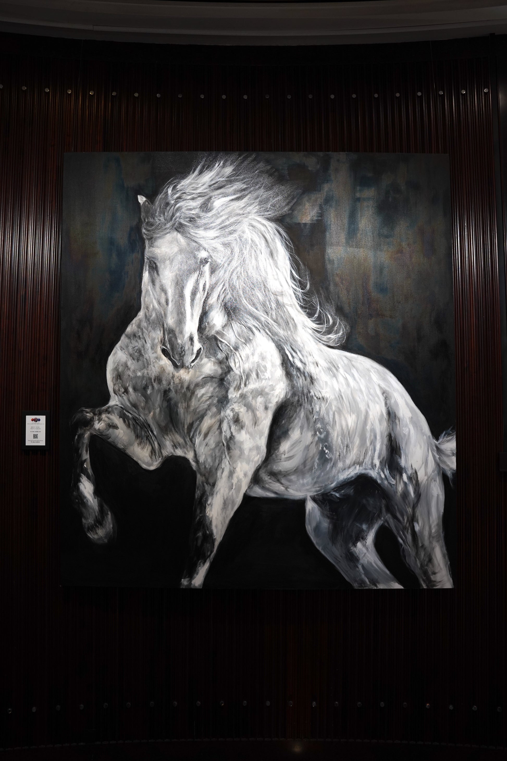Information: This is a horse breaking through the night, racing toward the dawn, symbolizing courage, determination, and fearlessness in the face of adversity; it is a striking white.